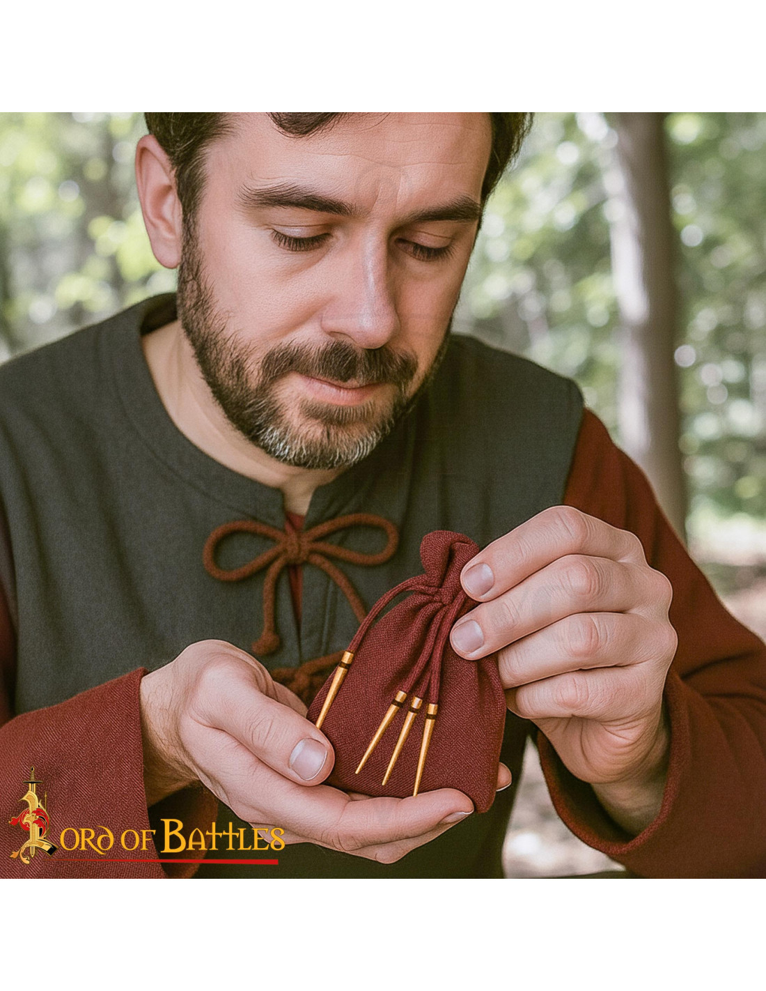 Med dette sæt med 10 middelalderlige messingstoppe til snore får du tilstrækkeligt materiale til at renovere støvler, tasker, renæssancebeklædning eller detaljer i rustninger, uden at du løber tør til reparationer eller til at skabe nye stykker med et personligt præg. De fungerer særligt godt for LARP-entusiaster, kostumeværksteder og håndværkere, der søger holdbare og karakterfulde finish.