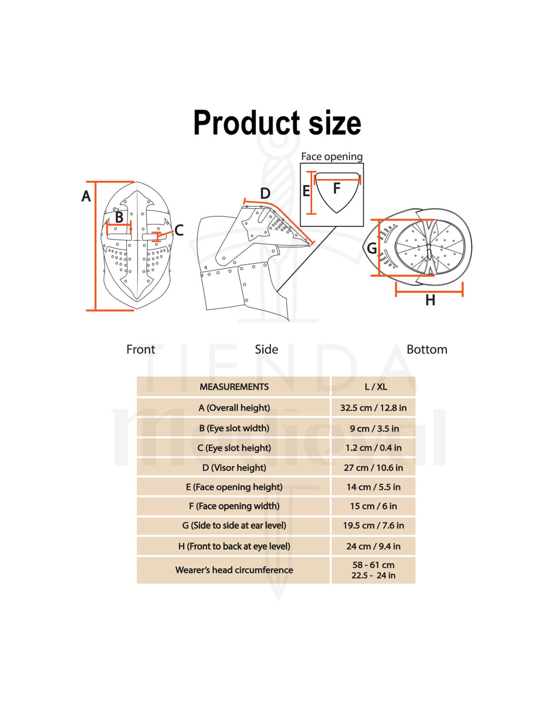 Dette middelalderske bacinete med visir ridder fra det 14. århundrede, med sort finish tilbyder fuldstændig ansigtsbeskyttelse uden at gå på kompromis med komforten, takket være et hængslet visir, der giver mulighed for at kontrollere synlighed og ventilation i hver bevægelse. Det horisontale synsgab og de cirkulære lufthuller sikrer, at du kan bevare den taktiske fordel, mens du ånder let og holder en sikker synslinje.