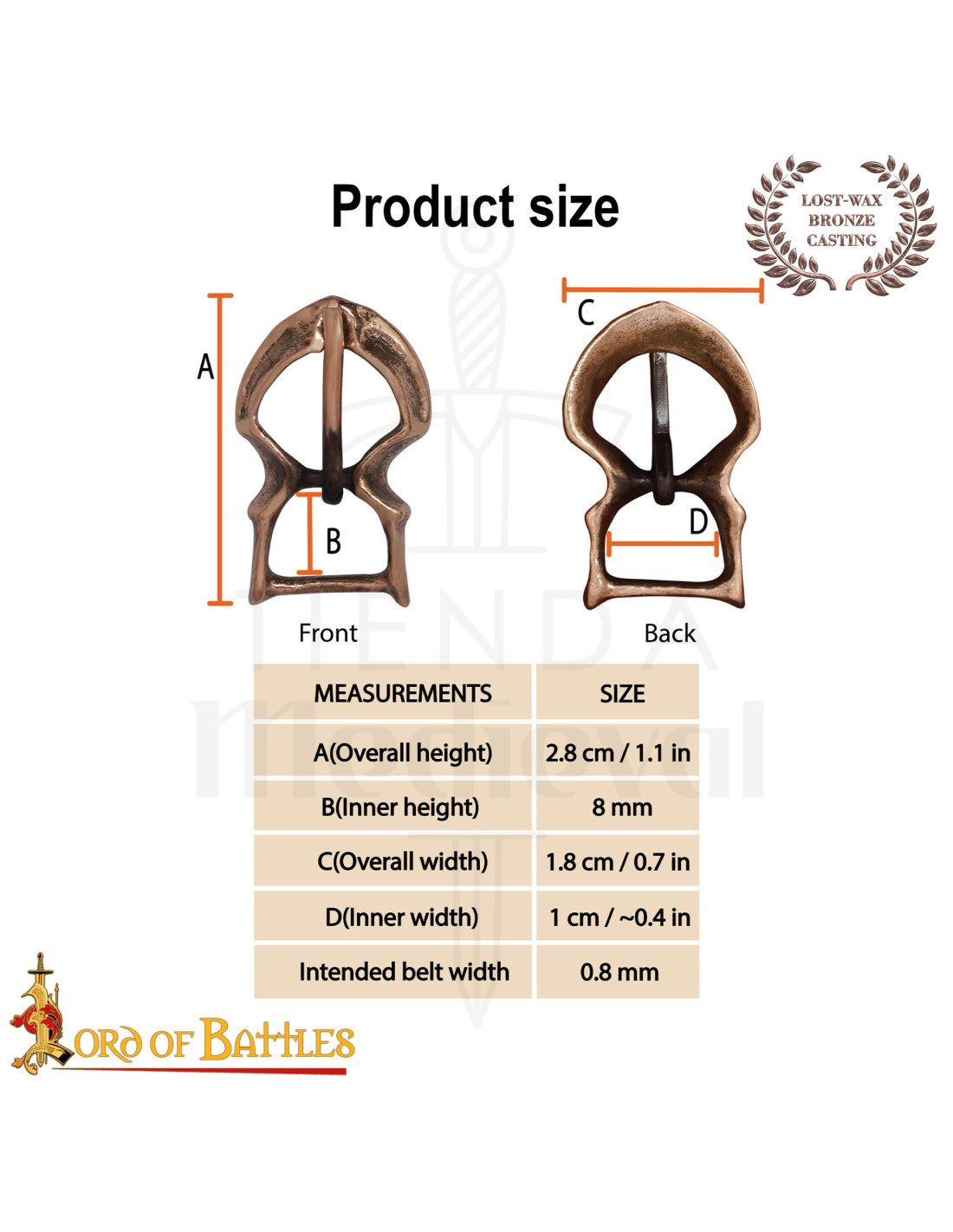 Fremstillet i bronze, sammensat af kobber og tin, afspejler hver spænde mesterligheden hos erfarne håndværkere, der holder den middelalderlige tradition i live. Let, med omkring 4 gram, er den perfekt til bælter op til 1 cm bredde, samt ideel til at fastgøre fodtøj, tasker eller små lukninger på beklædning og accessories.