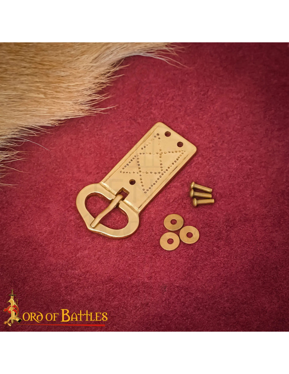 Spændet har den polerede gyldne glans, der straks tilfører tilstedeværelse og elegance, perfekt til at fremhæve smalle bælter, tasker eller tidsperiodens tilbehør. Dets geometriske design med stjernemønster, indkapslet i en rektangulær ramme, tilføjer et visuelt tiltrækningskraft, der fanger opmærksomheden uden at være overvældende, og fremkalder den smag og elegance, som kommunikerede position og forfinelse i senmiddelalderen.