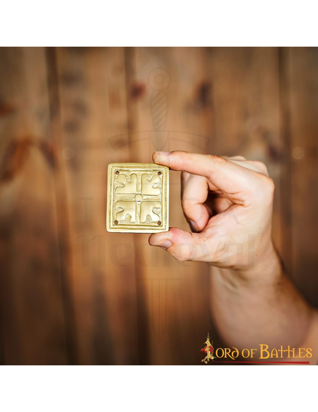 Hver guldplade i Sæt med 3 dele romersk cingulum dekoration i messing tilføjer det autentiske præg, der adskiller reenactere og samlere, takket være et blomsterrelief og et centralt kors afsluttet med volutter, med en forhøjet cirkel i hjertet af designet. Den polerede finish og de reliefframmer giver kontrolleret glans på tøjet, hvilket fremhæver teksturer og skygger, så motiverne kan ses, selv på afstand.