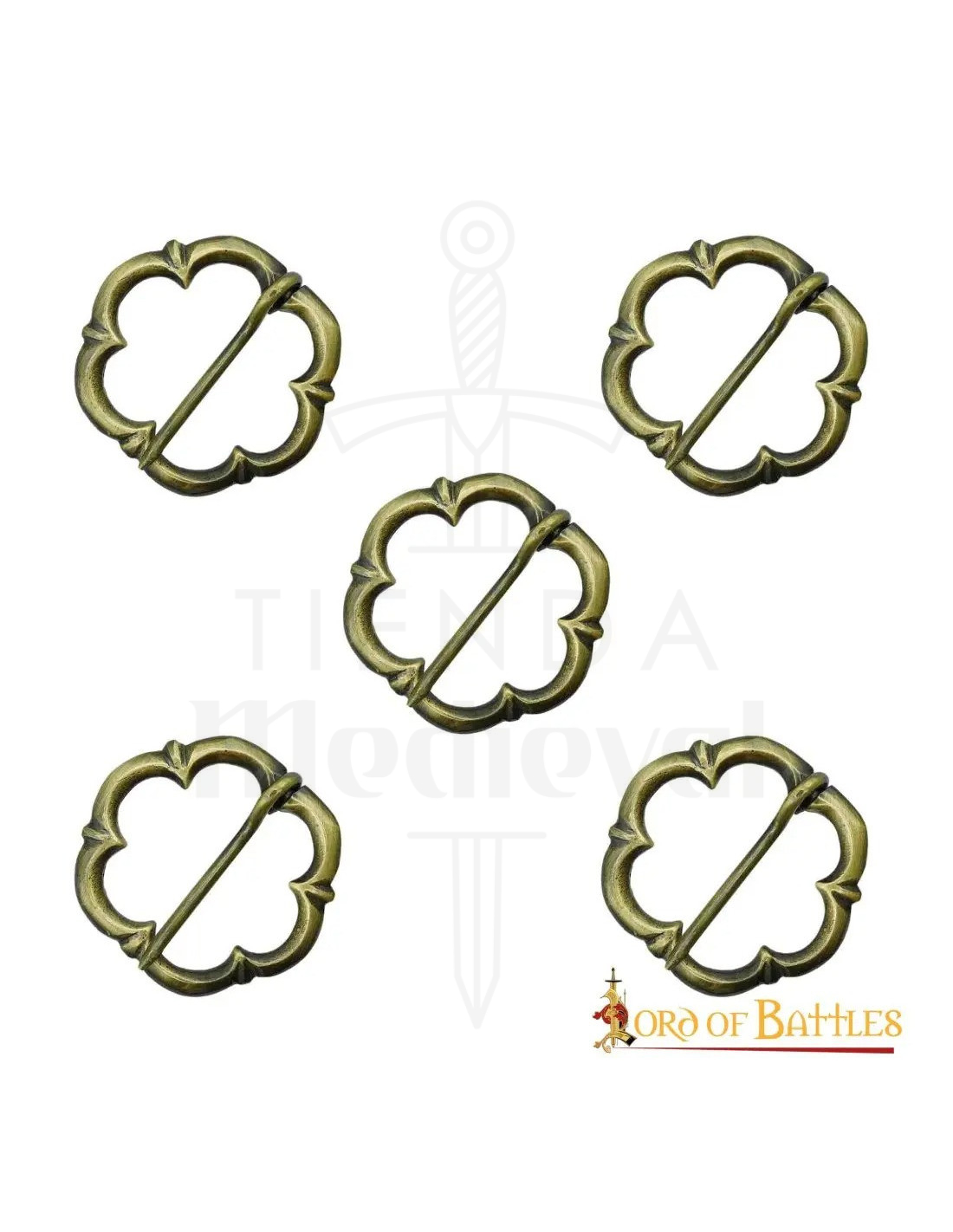 Dette sæt med fem spænder bringer den effekt: den ældede bronzefarve og det subtile relief fremkalder håndlavede materialer, der giver dig et autentisk udseende uden besvær. Hver spænder passer let på lag, kapper eller klæder, dens centrale stang sikrer holdbarhed og giver dig mulighed for at bevæge dig med tillid under lange begivenheder.
