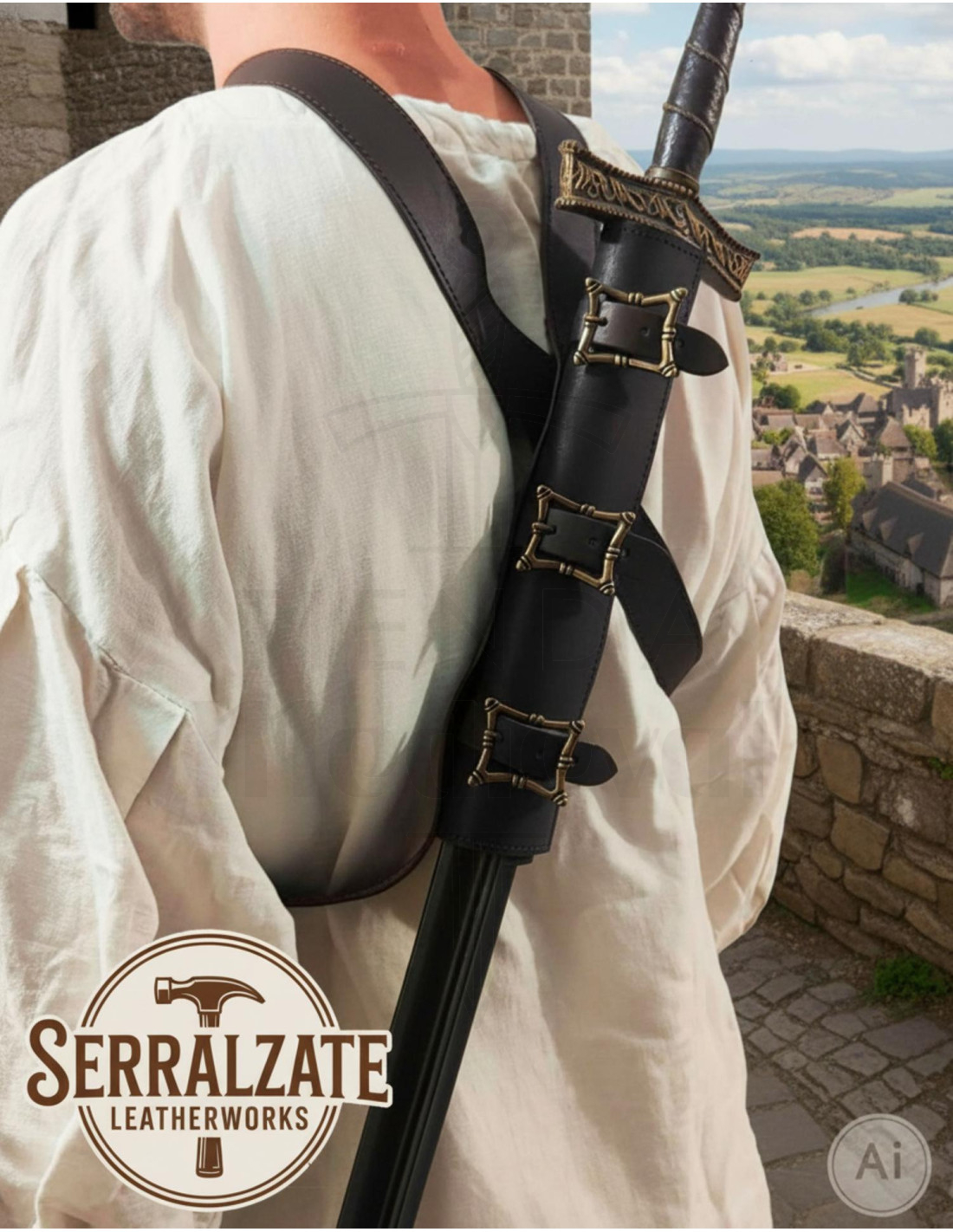 Opdag tahalí med bælte til at hænge sværdet på ryggen fra Serralzate LeatherWorks, et unikt og funktionelt tilbehør designet til elskere af kvalitet og håndværksmæssig stil. Fremstillet i slidstærkt sort læder, kombinerer dette system af stropper komfort og enestående design, ideelt til sikkert og tilgængeligt at transportere dit sværd.