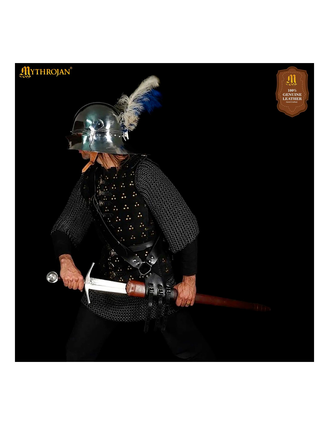 Håndlavet af høj kvalitet læder er det ikke blot slidstærkt nok til at modstå konstant brug, men tilføjer også et elegant præg til ethvert middelalderligt outfit. Det dybe sorte finish fremhæver den klassiske udseende, hvilket får enhver kombination, fra tunikaer til rustninger, til at se mere autentisk og velplejet ud.
