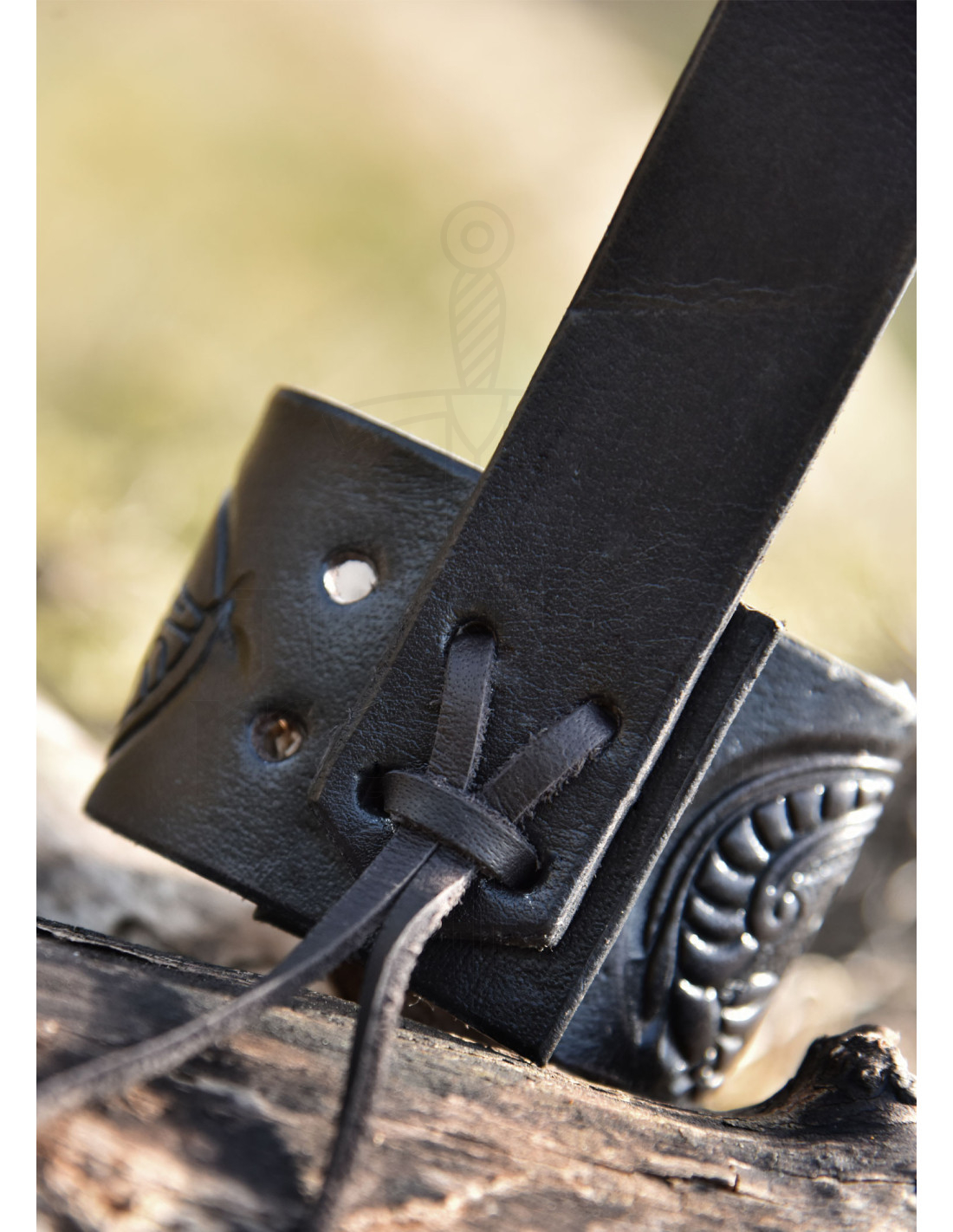 Derudover sikrer justeringen med snører på bagsiden, at den passer perfekt til størrelsen på dit horn, hvilket gør den nem at transportere og bruge ved enhver lejlighed. Uanset om det er til historiske reenactments, temafester eller blot for at nyde en drik med stor personlighed, tilbyder denne holder komfort og elegance.
