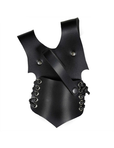 Fremstillet i holdbart læder, giver den intense sorte finish et elegant præg og passer til enhver middelalder- eller fantasygarderobe. Dets struktur, der minder om en sele eller brystplade, tilbyder dækning og stabilitet takket være dets flere sektioner og nagler, der sikrer en sikker pasform. Derudover har det et snøresystem i bunden, som gør det nemt at justere, så det sidder perfekt på din overkrop.