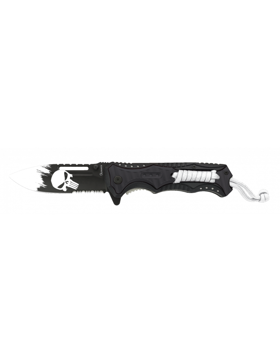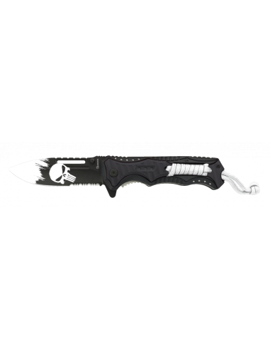 Klingen er lavet af 3CR13MOV stål med en tykkelse på 2,70 mm og er takket til skæring af grene og andre hårde materialer. Det opspændte aluminiumshåndtag er dekoreret med et Punisher-kranie, hvilket gør det unikt og attraktivt.