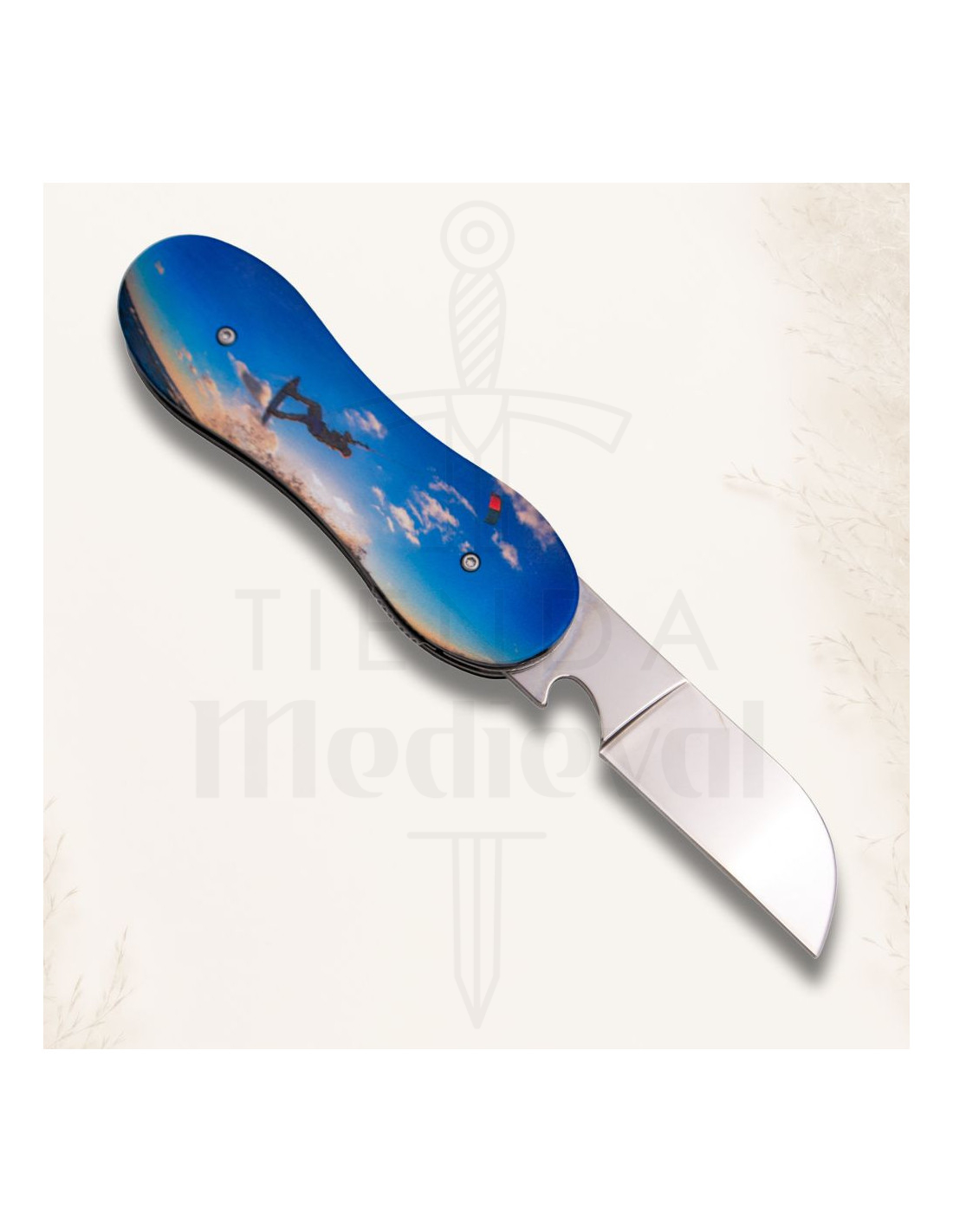Med et håndtag i aluminium, der kombinerer styrke og lethed, tilpasser denne kniv sig perfekt til dine behov. Dens design med 3D-prægning på begge sider præsenterer et levende grafik af en kitesurfer i aktion, der fremkalder følelsen af havet og bølgerne. Hver gang du bruger den, vil du huske friheden, du føler, når du glider over vandet.