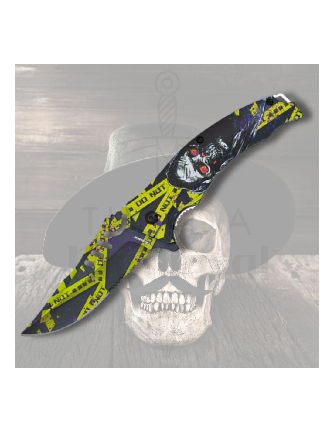 Det buede blad, belagt med en dyb sort, der fremhæver de livlige detaljer i gult og lilla, tiltrækker ikke kun alle blikke, men giver også en glat og præcis skæreevne takket være kvaliteten af 3Cr13Mov-stålet. Illustration af kraniet med røde øjne og båndet 'DO NOT' giver den et karakteristisk præg, ideelt for dem, der værdsætter personlighed i deres værktøjer.