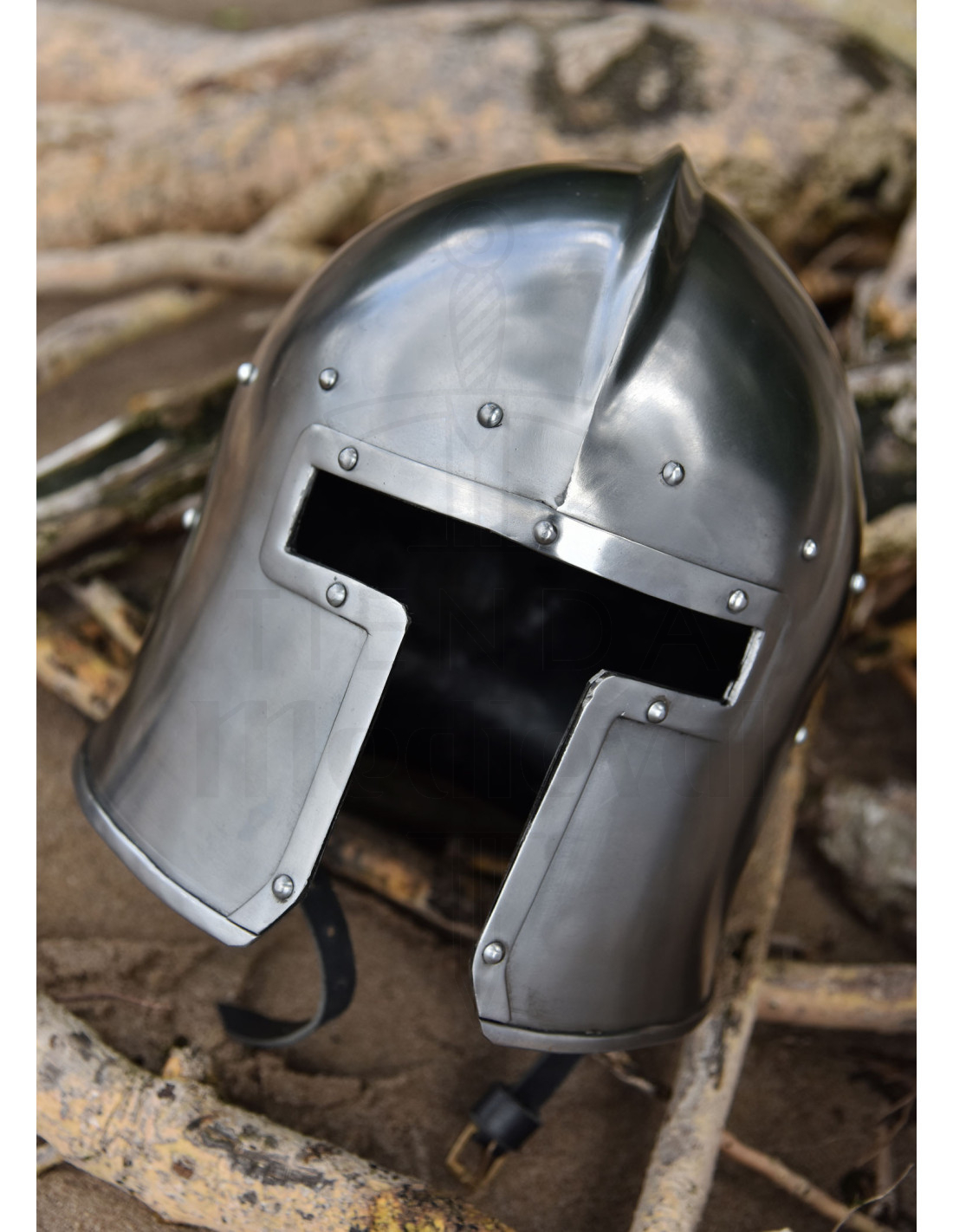 Denne barbute er omhyggeligt håndlavet i 2 mm tykt stål, hvilket giver den enestående modstand. Messingnitter tilføjer æstetiske detaljer og giver dig også mulighed for at tilføje ekstra Aventail-formet bryst- og skulderbeskyttelse, hvis det ønskes.