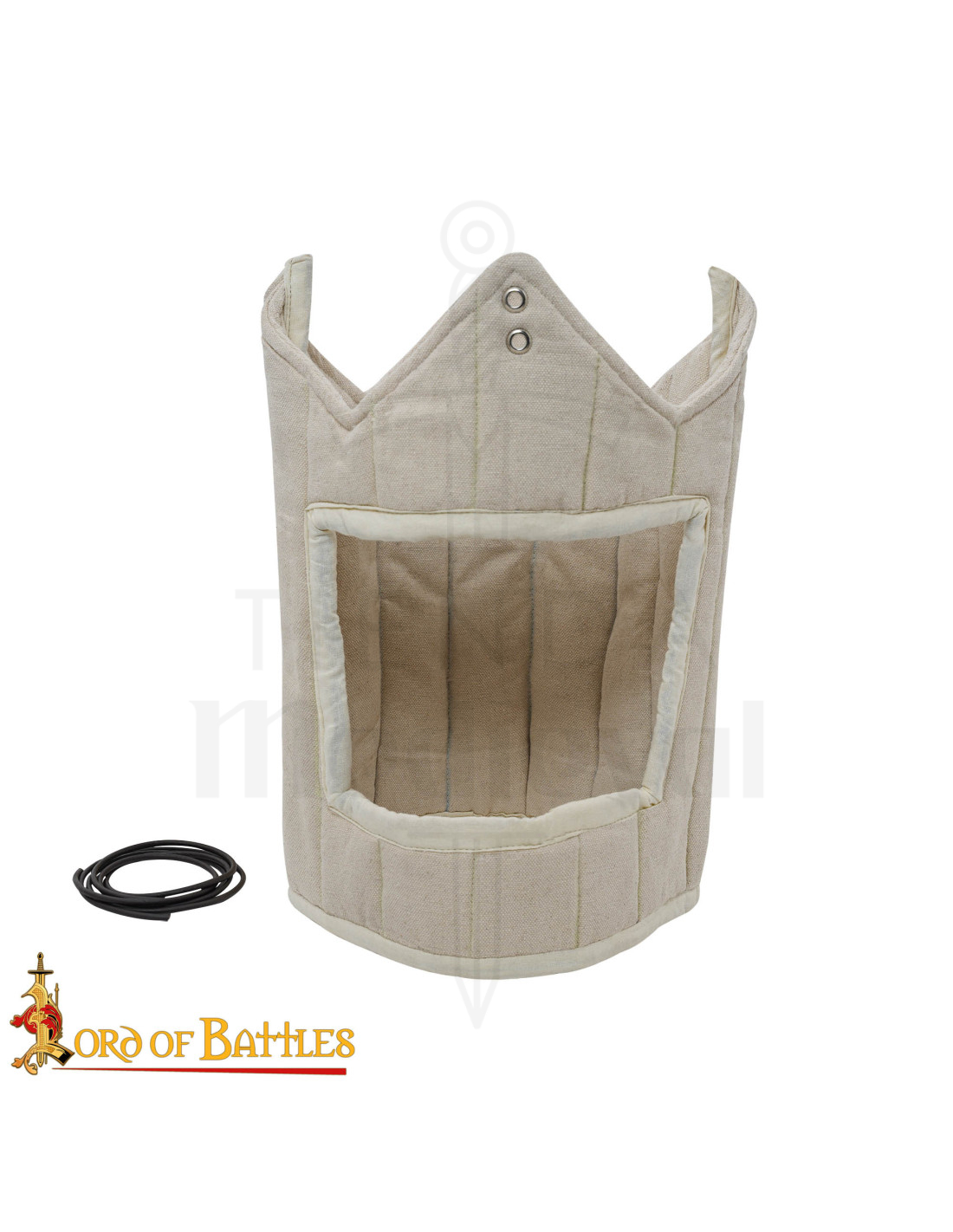 Fremstillet af åndbart bomuldscanvas og solid polstring, garanterer dens forstærkede konstruktion og holdbare sømme, at den kan tåle hyppig brug uden at miste formen. Den polstrede kant omkring åbningen tilfører blødhed, hvor du har mest brug for det, og de metalliske øjer sammen med den centrale knap gør det nemt at fastgøre foringen sikkert. Derudover tillader det ægte læderreb til hurtigt justering af foringen for at holde den på plads under kampe, parader eller træningssessioner.