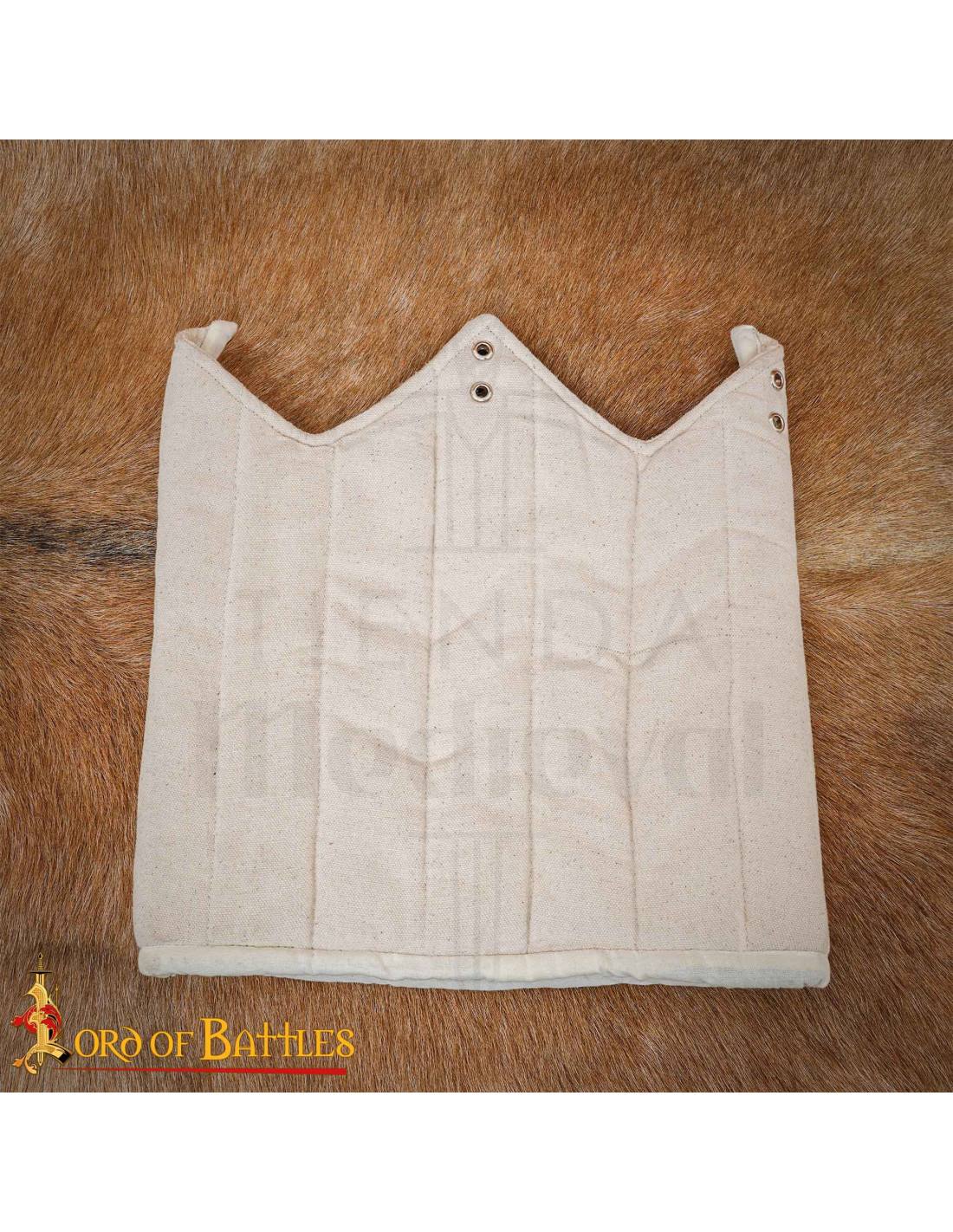Tilgængelig i klassisk sort for et diskret finish og i naturlig ecru for et mere historisk ægte udseende, passer den perfekt i samlinger, opsætninger og træningsaktiviteter. Teksturen og de vertikalt synlige sømme understreger dens autentiske æstetik, som det ses på det beige stykke, billedet viser, med det store frontåbning og justeringssnoren på den ene side.