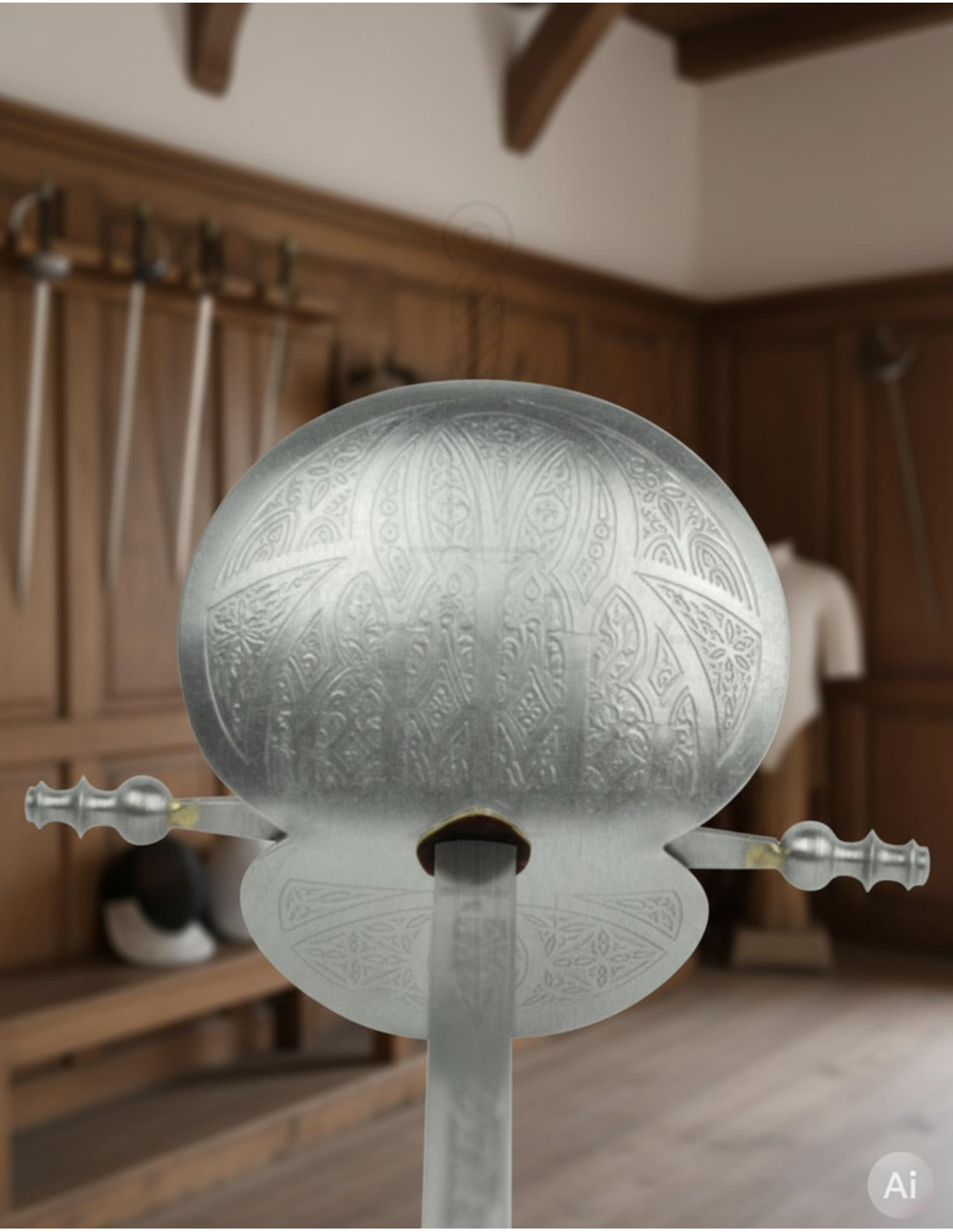 Dette muslingeskjold er designet og fremstillet ENESTE OG UDELUKKENDE TIL ÆSTETISKE OG SAMLEOBJEKTER. DET er IKKE egnet til fægtesport, træning, rekreation eller nogen funktionel anvendelse. Det er et væg- eller vitrine-stykke, ikke et funktionelt våben.