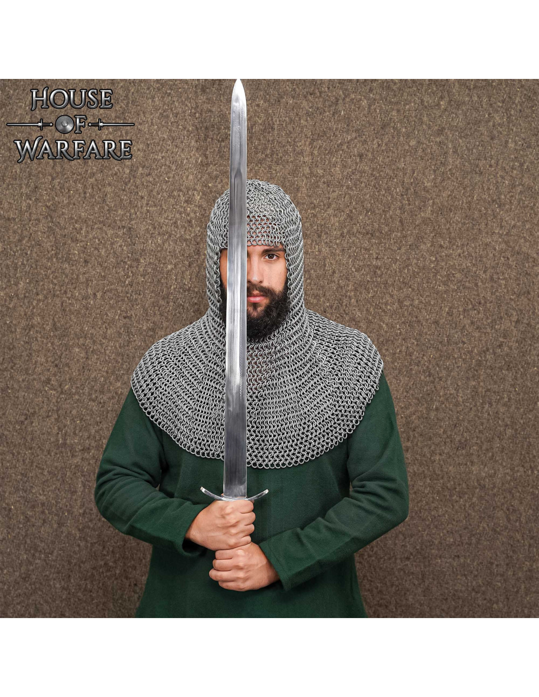 Denne hætte fremkalder den middelalderlige periode fra 1100-tallet til 1300-tallet og genskaber den klassiske europæiske silhuet med en kant, der beskytter nakke og skuldre uden at begrænse bevægelserne. Dens mat grå finish med ståludseende giver et robust og realistisk udseende, som det kan ses på billedet, hvor kæden falder naturligt over hovedet, skuldrene og den øverste del af brystet.