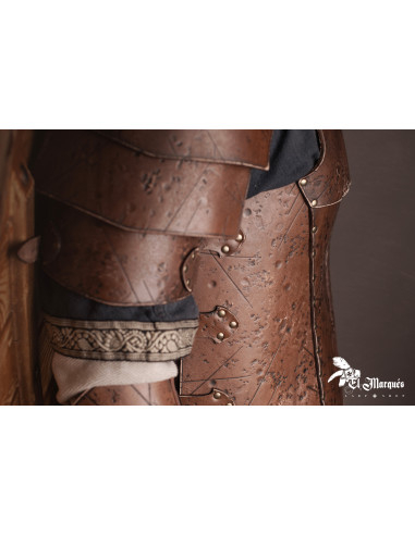Denne panser er lavet af fuldnarvet, vegetabilsk garvet læder og består af overlappende plader, der afleder slag og giver fremragende beskyttelse uden at ofre mobilitet. Dets keltiske design er ikke kun funktionelt, men også æstetisk tiltalende, prydet med gyldne runeprint og ruskindsreb-syning, hvilket sikrer en sikker og behagelig pasform takket være dens tre lange ruskindsstropper og messingspænder på siderne.