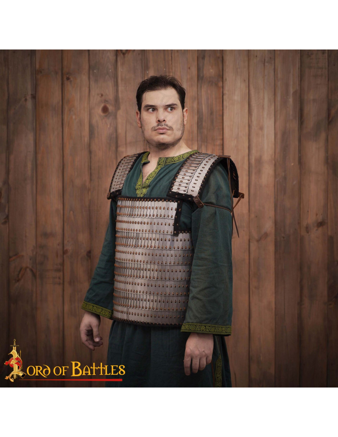 Inspireret af traditionerne for lamellarmorer fra vikinge-, byzantinske og orientalske kulturer, giver det lagdelte design en fleksibel og effektiv beskyttelse. Hver skive er omhyggeligt fastgjort til en forstærket læderbase, hvilket tillader naturlig bevægelse uden at gå på kompromis med beskyttelsen – ideelt til kampe, prøver eller udstillinger. Den blanke sølvfinish og de brune detaljer tilføjer et autentisk og iøjnefaldende præg, mens justerbare stropper på skuldre og sider sikrer en perfekt og personlig pasform.