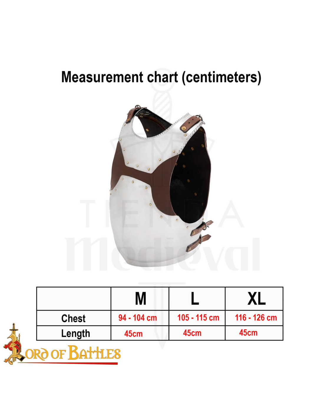 Dets strukturerede design med kurvede former og vinkler muliggør fremragende bevægelighed, ideel til at bevæge sig sikkert under reenactments, LARP eller teaterforestillinger. Styrken fra stålet kombineres med læderets fleksibilitet, hvilket giver effektiv beskyttelse mod slag mod bryst og mave uden at begrænse dine bevægelser.