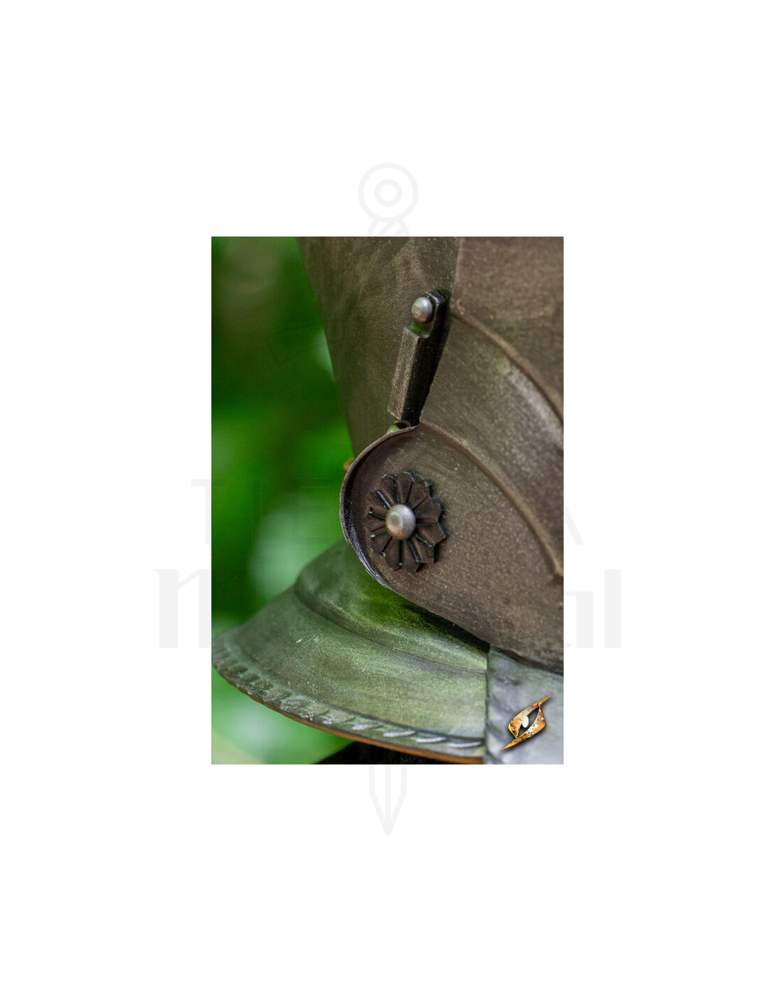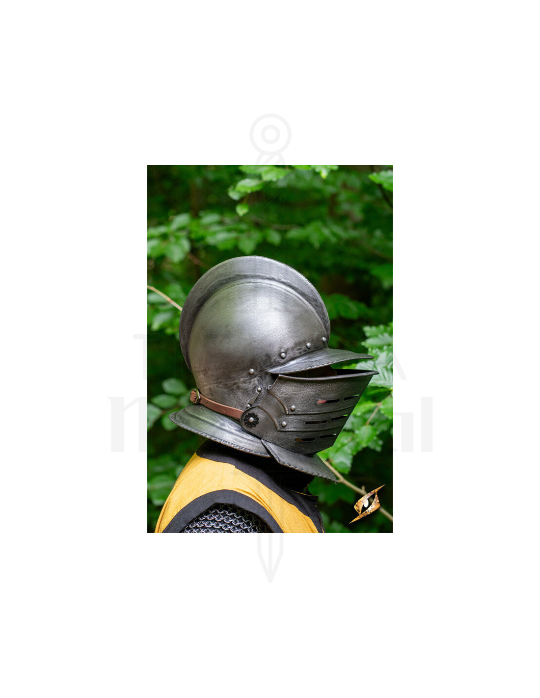 Perfekt til dem, der ønsker at skille sig ud på middelalderlige markeder eller historiske arrangementer, kombinerer denne hjelm funktionalitet med et klassisk og iøjnefaldende design.