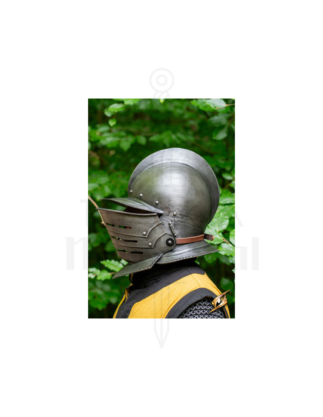 Fremstillet i 1 mm tykt stål, giver dens mat sorte finish ikke kun et imponerende udseende, men hjælper også med at modstå korrosion i udendørs omgivelser. Det forstærkede visir med åbninger giver klar udsyn og effektiv ventilation, så du kan forblive komfortabel under lange kampe eller forestillinger. Det synlige naglearbejde afspejler en robust og holdbar konstruktion, klar til at modstå krævende brug i reenactments eller live rollespil.
