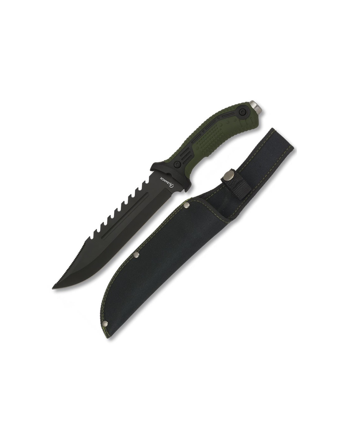 Hvis du leder efter en højkvalitets taktisk kniv, der tilbyder maksimal alsidighed, er denne grønne taktiske kniv lige, hvad du har brug for. Med en 19,5 cm klinge lavet af rustfrit stål og en takket klinge i to størrelser, er denne kniv i stand til at skære igennem alt.