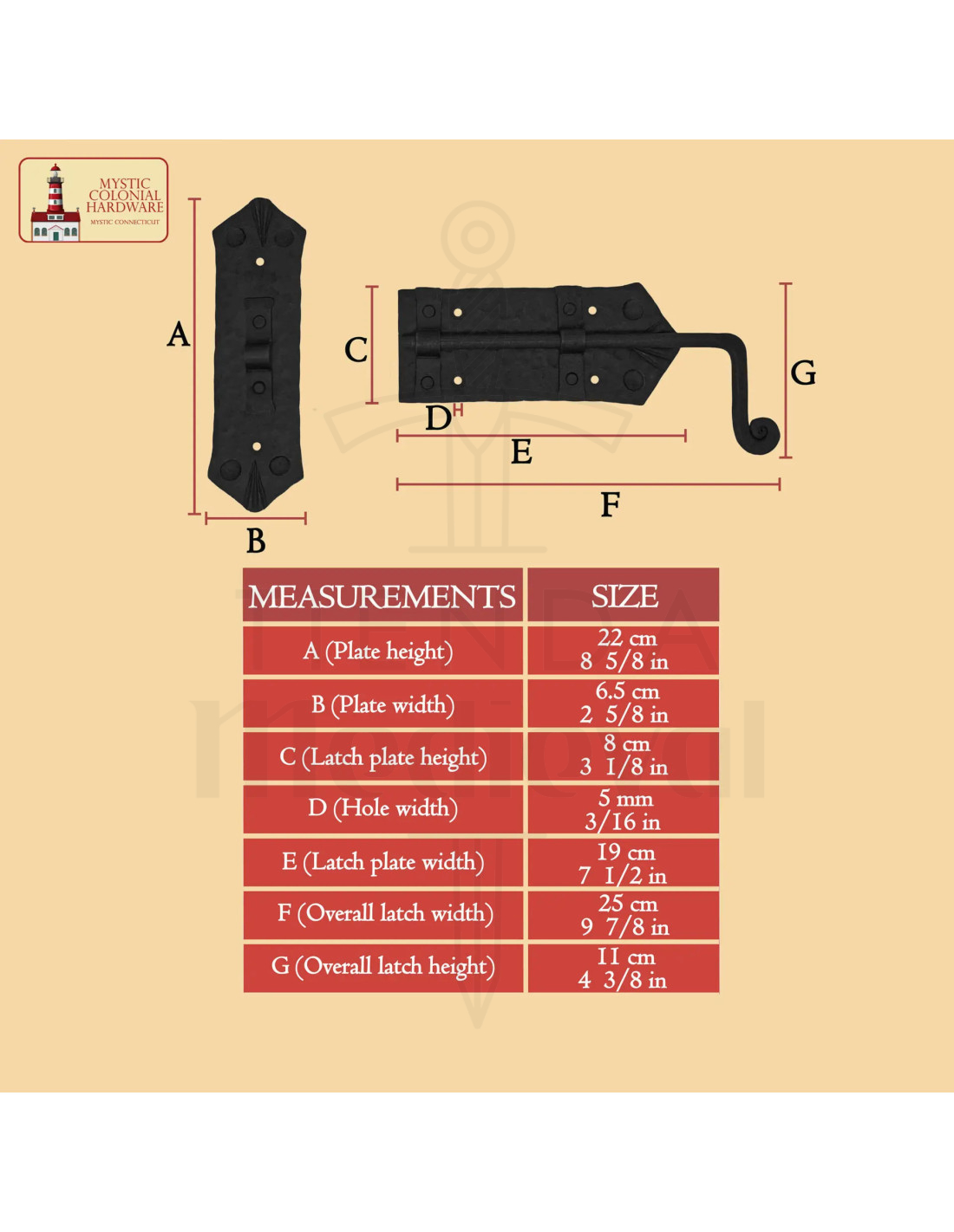 Håndsmiddet i massivt jern, tilbyder den en følelse af soliditet, der mærkes ved berøring, og dens krøllede spids gør det nemt at åbne og lukke med en naturlig bevægelse uden anstrengelse. Pladen med løkken og spidse ender sikrer en stabil lukning, hvilket giver ro i indgange til have, porte eller udendørs døre.