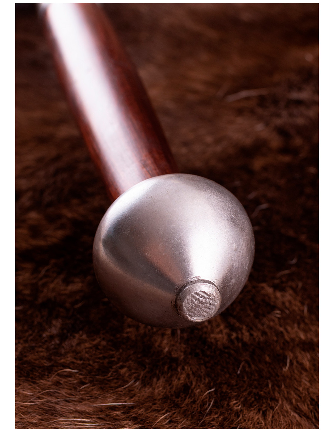 Dette imponerende 16. århundredes Claymore har et fuldt skaft, bredt og jævnt spidset blad, smedet i EN45 fjederstål. Bladet er omhyggeligt afrundet omtrent midt på længden, og kanterne er ikke skærpet, hvilket gør det sikkert at håndtere og udstille. Håndtaget, der er kendetegnet ved sin løgform, og den elegante 29 cm lange guard er lavet af robust stål. Grebet har en finish af farvet og poleret træ, hvilket tilføjer ægthed og elegance.