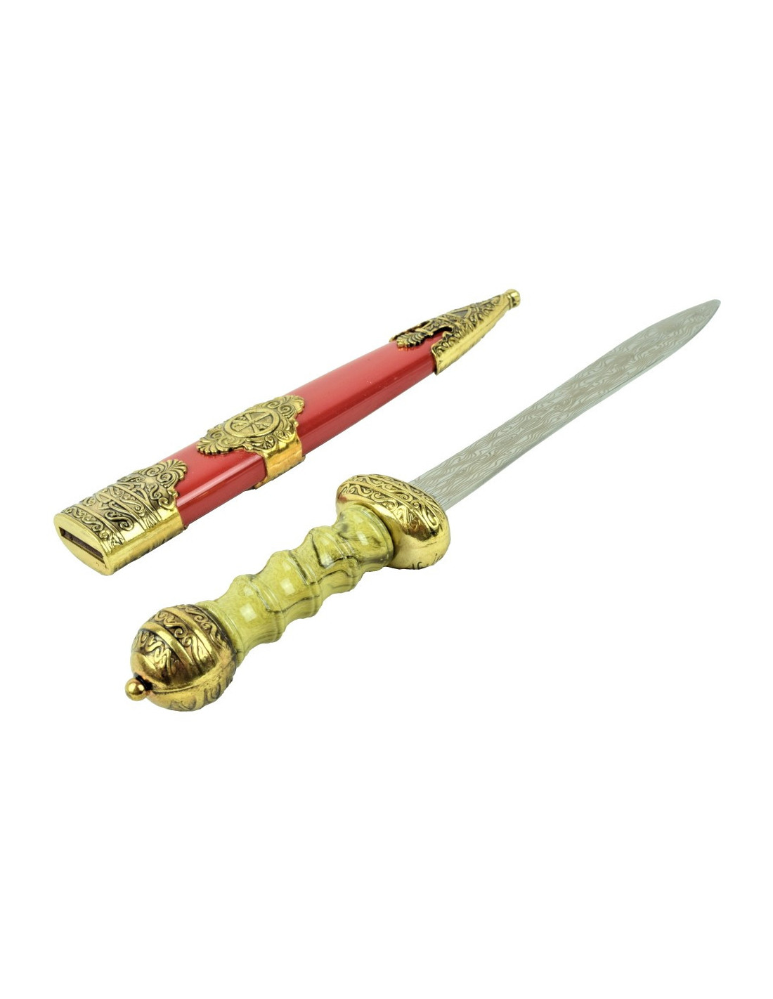 Den romerske dolk med bronzebehandlet pommel er det perfekte supplement til enhver elsker af romersk historie og kultur. Denne elegante dolk har et autentisk design og omhyggeligt udformede detaljer, der gør den til et unikt og specielt stykke. Dolkens stang er udført i antik bronze, hvilket giver den et attraktivt rustikt look. Derudover er håndtaget...