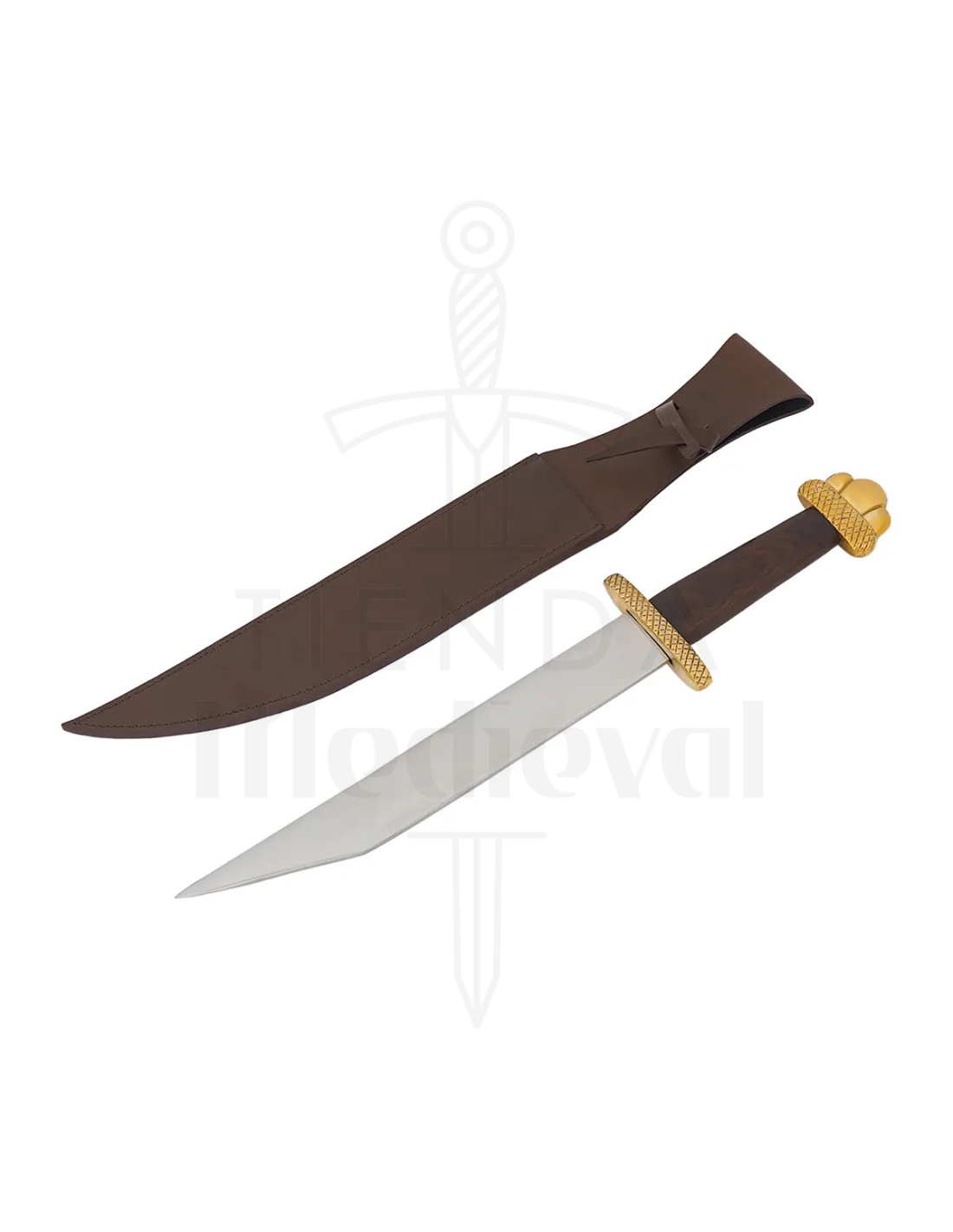 Etuiet, i mørkebrun farve og lavet af kunstlæder med synlige sømme, beskytter genstanden og gør transporten lettere. Dets brede øverste flap og det sikre lukke sikrer, at dolken holdes fast, klar til at trække, når lejligheden kræver det.