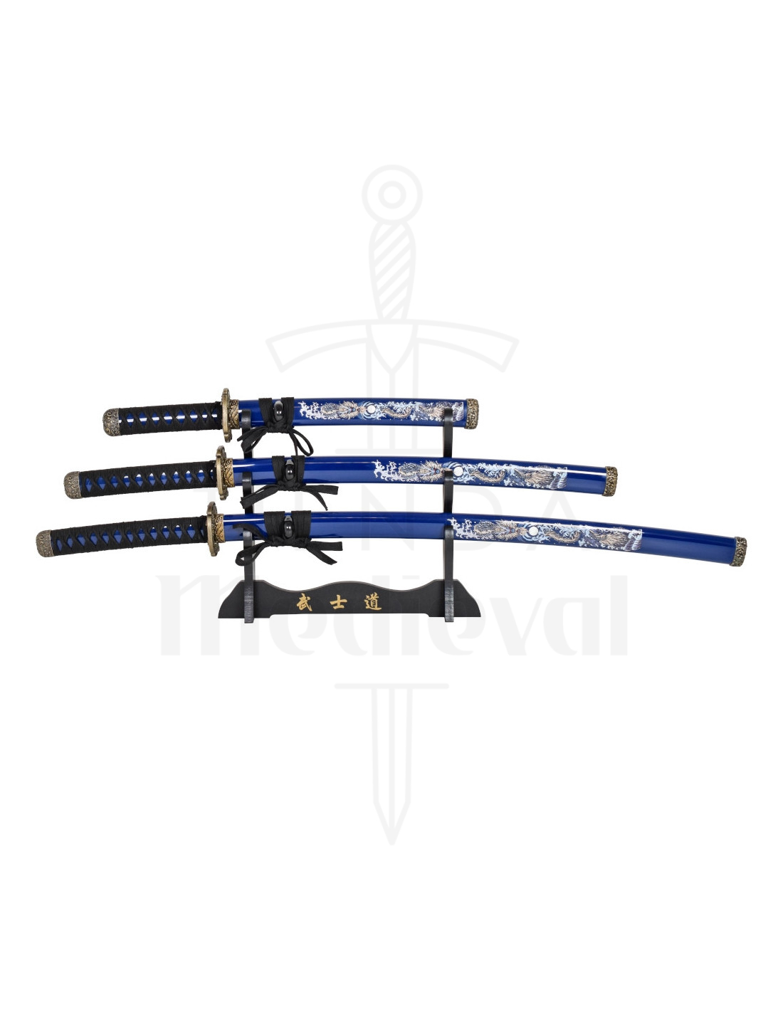 Den blå farves pragt fremhæver hver detalje i disse stykker, som inkluderer en katana, en wakizashi og et tanto, alle fremstillet af kulstofstål, hvilket giver en fremragende styrke og en holdbarhed, der vil følge dig i årene fremover. Håndtaget af træ og bomuld er en fryd for berøringen, der tilbyder et komfortabelt og sikkert greb, som forbedrer brugserfaringen.