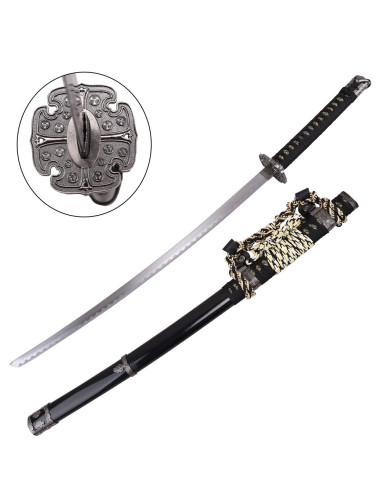 Hvis du ønsker at købe Dekorativ japansk katana i sort med sølv detaljer, vil du finde i denne model en fusion af traditionel æstetik og nutidig tilstedeværelse, ideel til samlere, dekoratører eller som en udsögt gave.