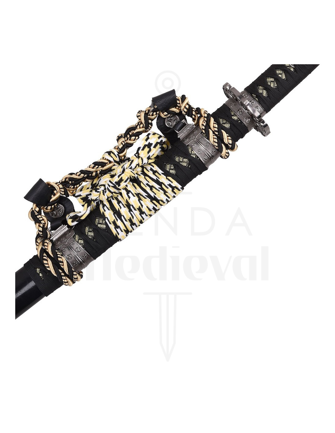 Grebet, som er indpakket i krydset sort snor, giver et æstetisk og markant greb, der lader den dekorative gyldne belægning komme til syne nedenunder, en kontrast designet til at berige helheden og tiltrække opmærksomheden i udstillinger eller vitrinere.