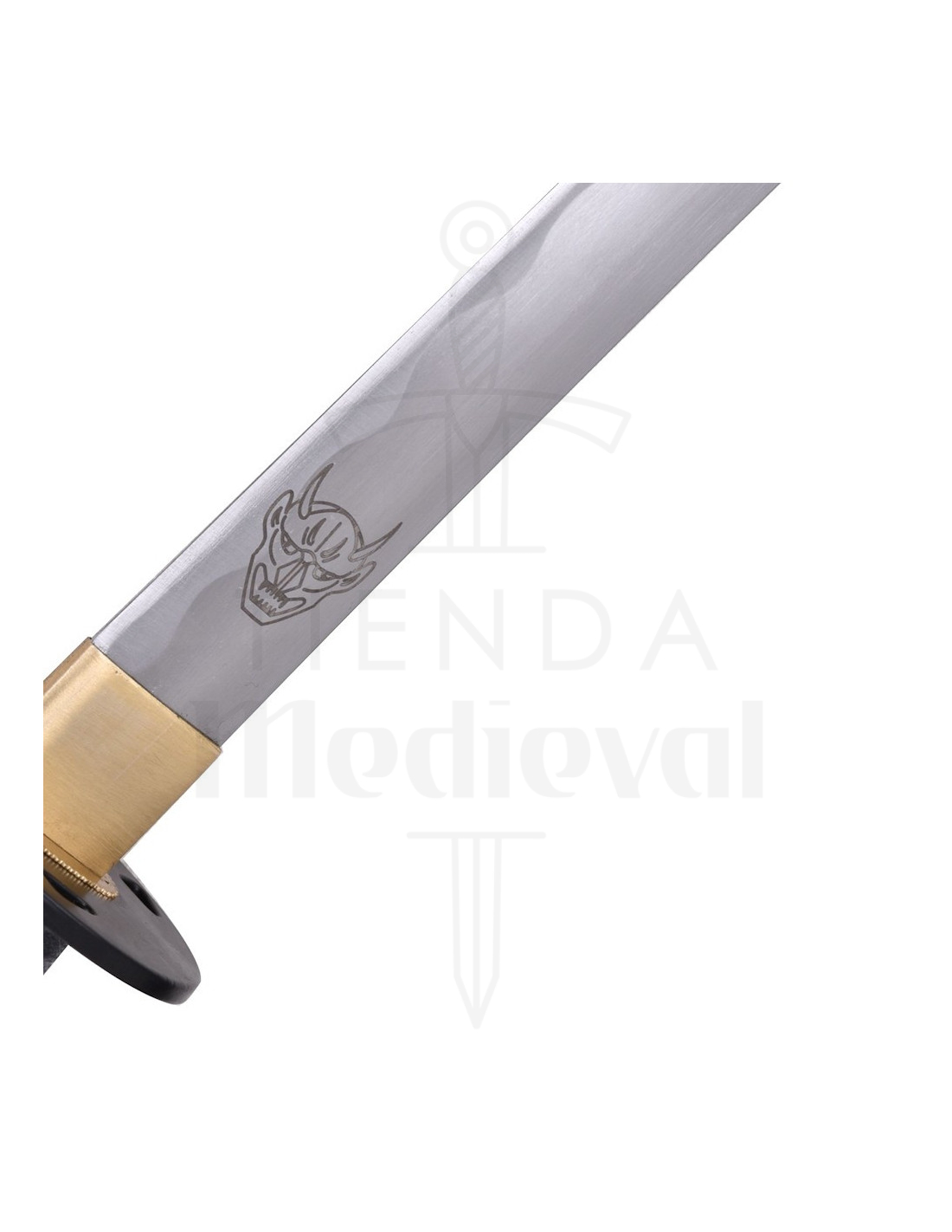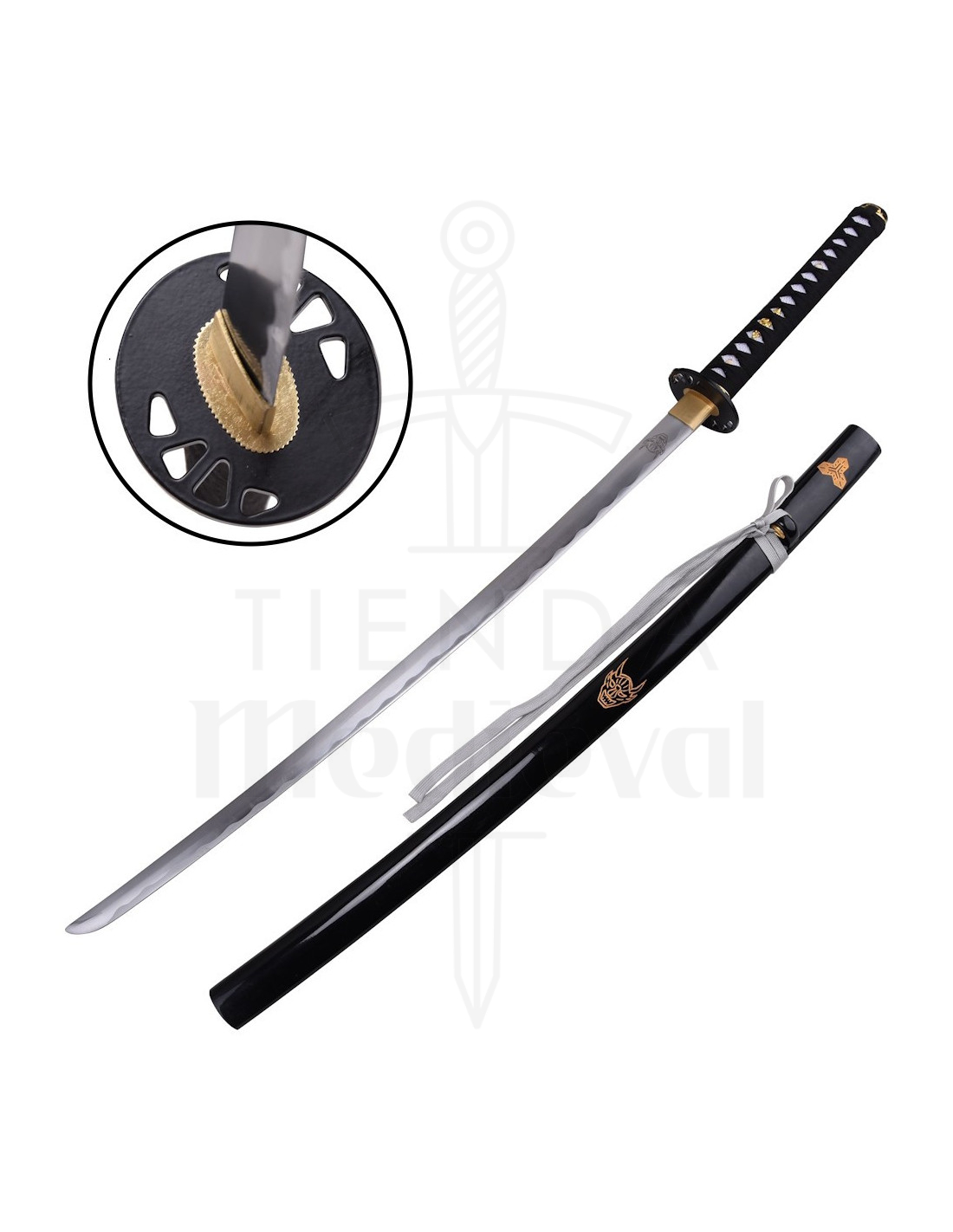 Dets blanke, buede blad, omhyggeligt poleret, reflekterer håndværkskvalitet og den dramatiske karakter i filmens scene. Tsubaen i metal, med perforeret design og gulddetaljer, tilføjer et strejf af mystik og sofistikation, mens håndtaget, dækket af mørkt materiale med traditionelle mønstre, giver en iøjnefaldende og elegant visuel tilstedeværelse. Den blanke sorte skede, pyntet med en let bue og gulddetaljer, fuldender dette kunstværk til stolt udstilling.