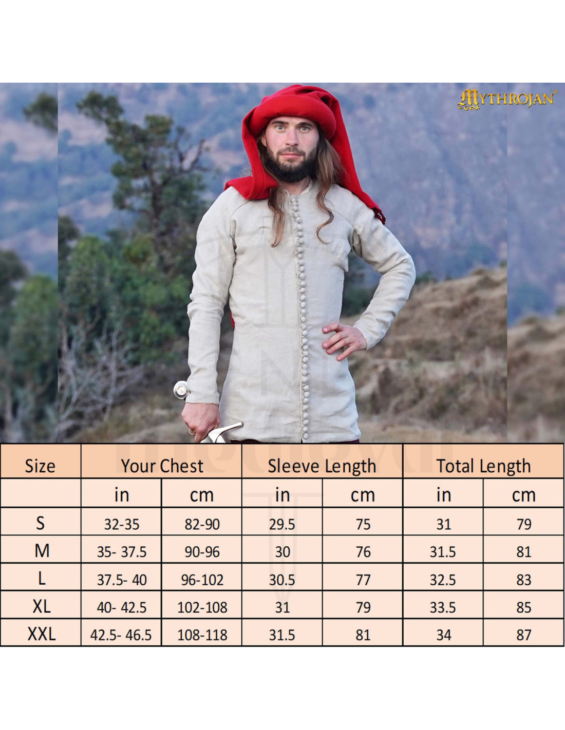 Hver 14. århundrede middelalderlig jupon i naturligt linned: Produktets officielle navn er håndlavet med klassiske teknikker, så der kan ses lette variationer i farve og tekstur, et sigte på ægte håndværk. Charles de Blois var en central skikkelse fra det 14. århundrede, og at bære dette stykke forbinder dig direkte med den historiske arv.