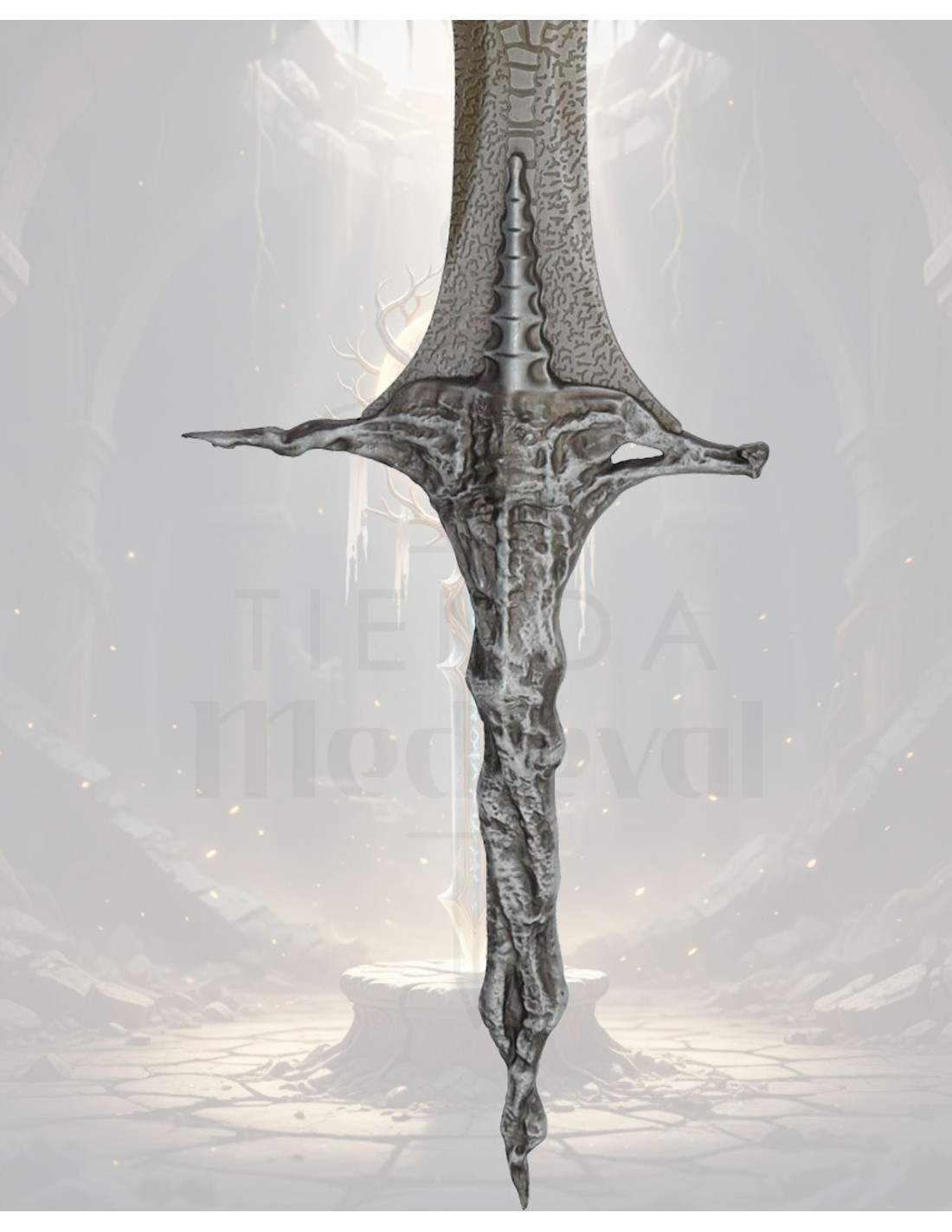 Hvis du er interesseret i at købe Dekorativ sværd Sacred Relic fra Elden Ring med stativ, får du et stykke designet til samlere og entusiaster af Elden Ring-universet, der fanger den episke atmosfære og ikonografien fra spillet uden at kræve museumsplads. Elden Ring som franchise har efterladt et indtryk på spillere med sin mørke æstetik og dybe mytologi, kvaliteter som dette stykke afspejler i sit design.