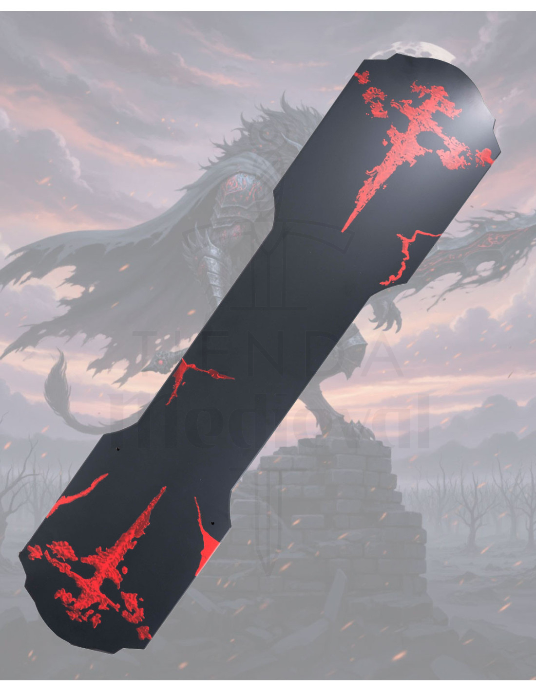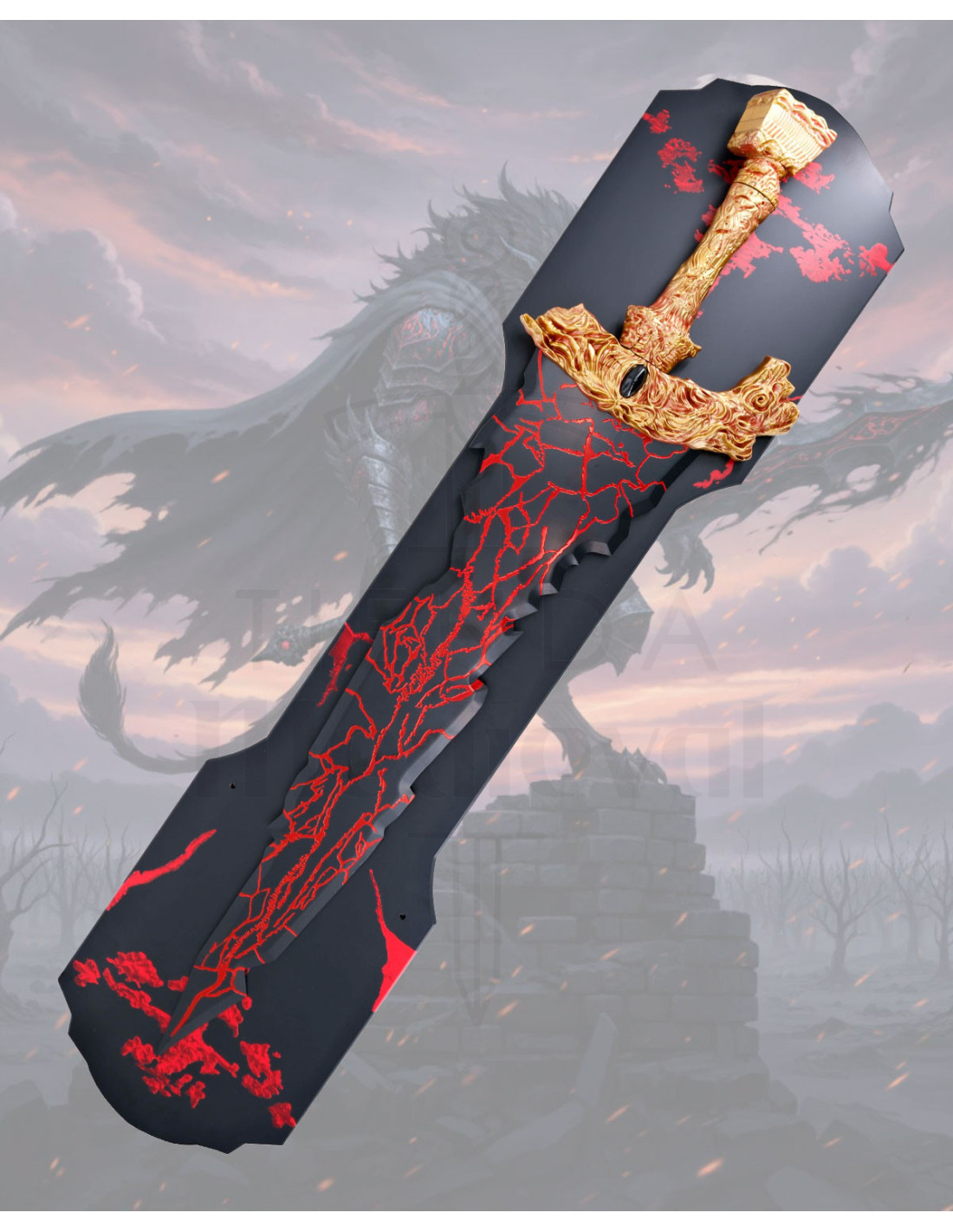 Denne udskæring indfanget essensen af Malikeths sorte sværd med en dyb sort finish og røde årer, der synes at pulserer, hvilket skaber et dekorativt stykke, der udstråler intensitet og karakter. Den ujævne kontur af bladet og de siderne f bladskåringer giver en aggressiv æstetik, ideel til at give personlighed til et hjørne i din samling.