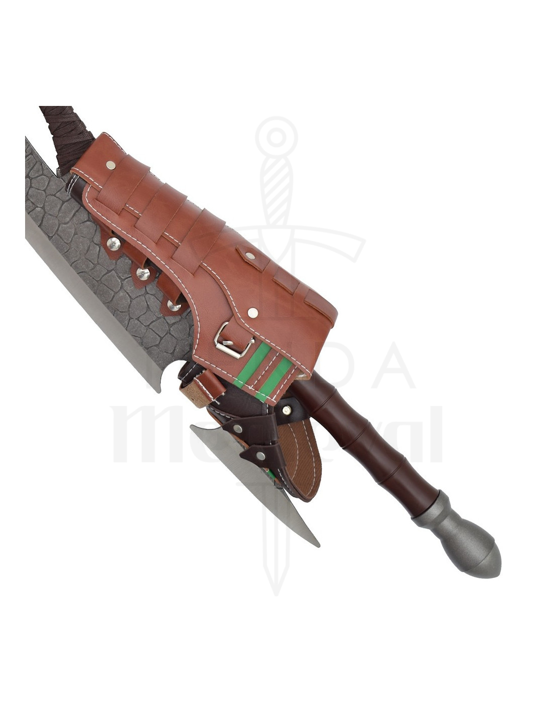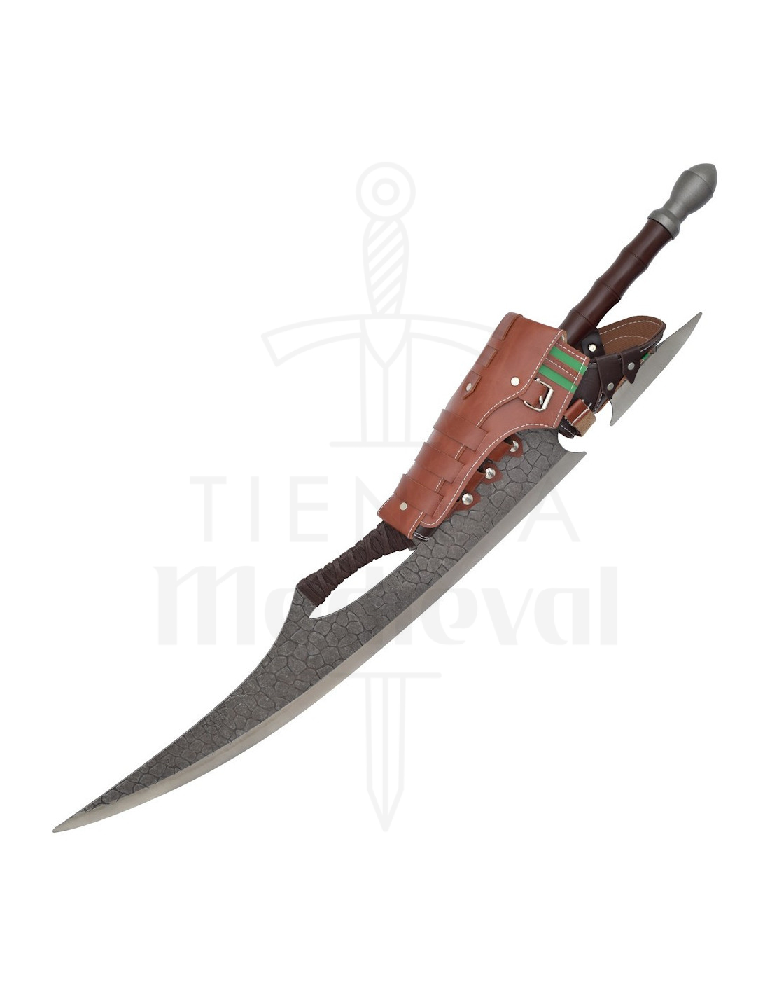 Dets blad, med en finish i sølv og en robust tekstur, giver et imponerende udseende, perfekt til udstilling i dit rum eller som tilbehør til cosplay. Håndtaget, i mørkebrunt, er indhyllet i kunstlæder og sikrer et fast og behageligt greb, hvilket gør det nemt at håndtere som dekorativt stykke eller til temafester. Derudover sikrer det brune læderhylster, dekoreret med metalbeslag og grønne detaljer, en elegant og funktionel beskyttelse til dit sværd.