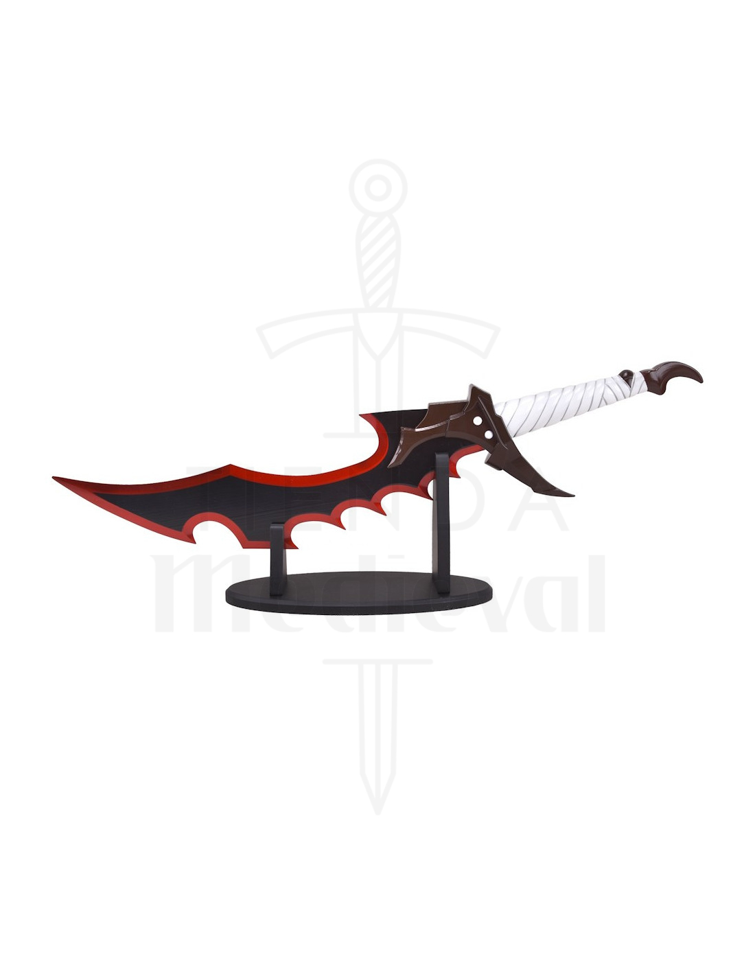 Mere end blot udseende, kommer bladet uden skarphed, så du kan udstille det med ro i sindet, placere det i en vitrineskab eller bruge det som tilbehør i fotoshoot uden risiko. Håndtaget, indpakket i en hvid snoet snor, giver visuel kontrast og en behagelig følelse, mens beskyttelsen og pommelen i mørkebrune nuancer tilføjer varme og en håndværkslig tilstedeværelse.