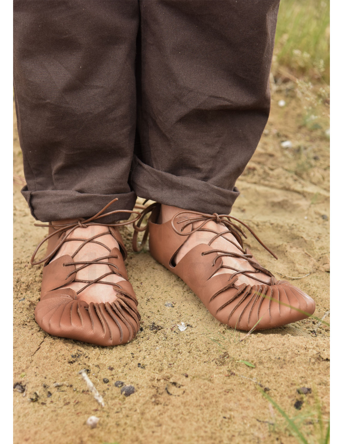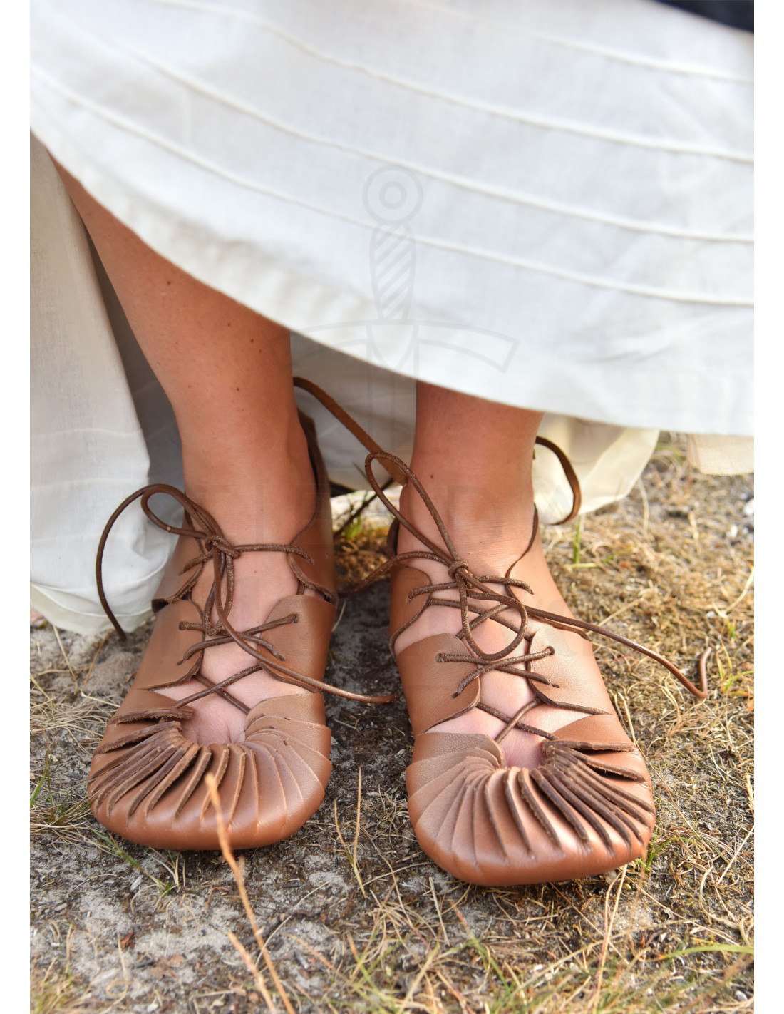 Deres enkle men elegante design med dekorative folder i frontområdet tilføjer ikke blot et karakteristisk og håndlavet præg, men forbinder også med en tradition, der går tilbage til det gamle Rom, hvor disse sandaler var et populært valg på grund af deres komfort og hurtige fremstilling.