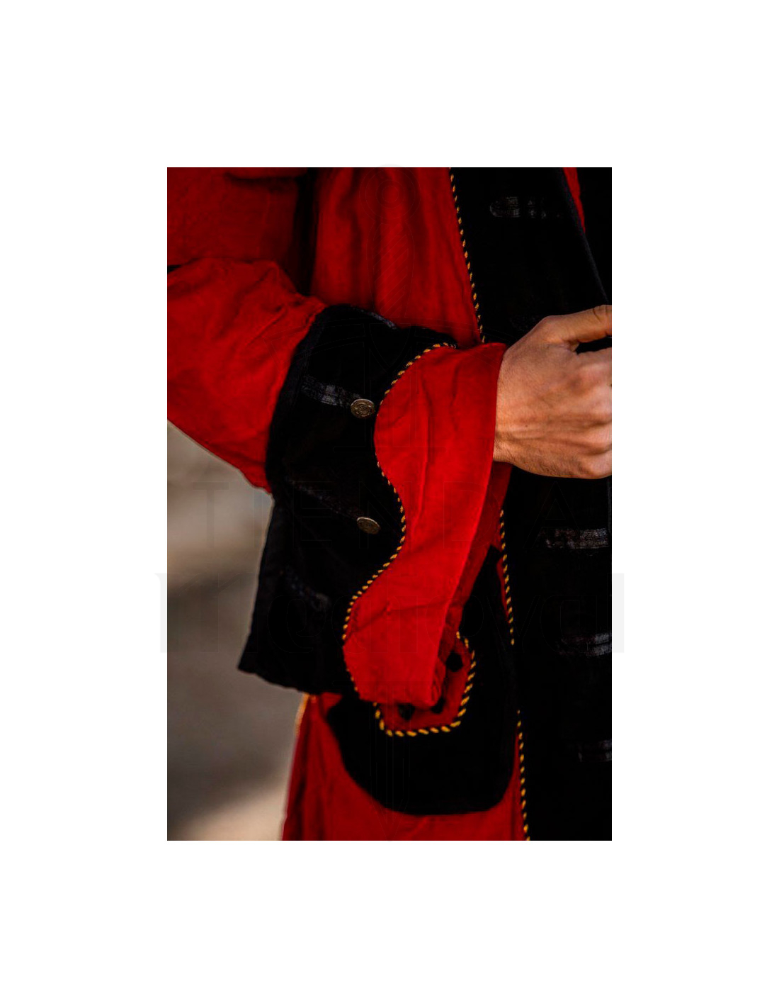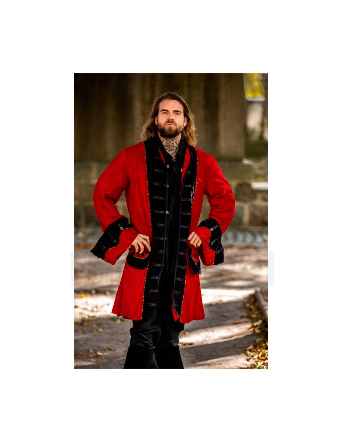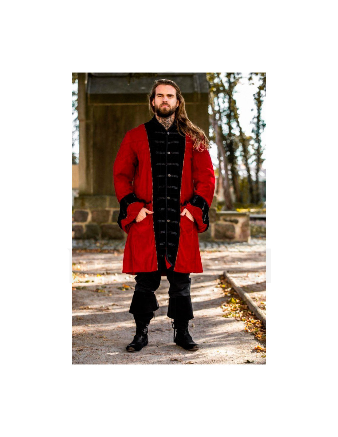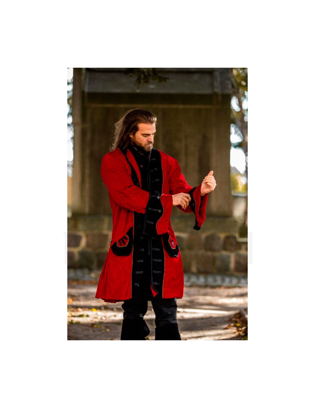 Vi præsenterer den imponerende renæssance-kortet piratjakke i rød-sort, fremstillet af 100% bomuld. Denne jakke er det perfekte valg for modeentusiaster, der søger en unik og sofistikeret stil. Derudover er den ideel til at styles med en båndskjorte, som det ses på billederne.