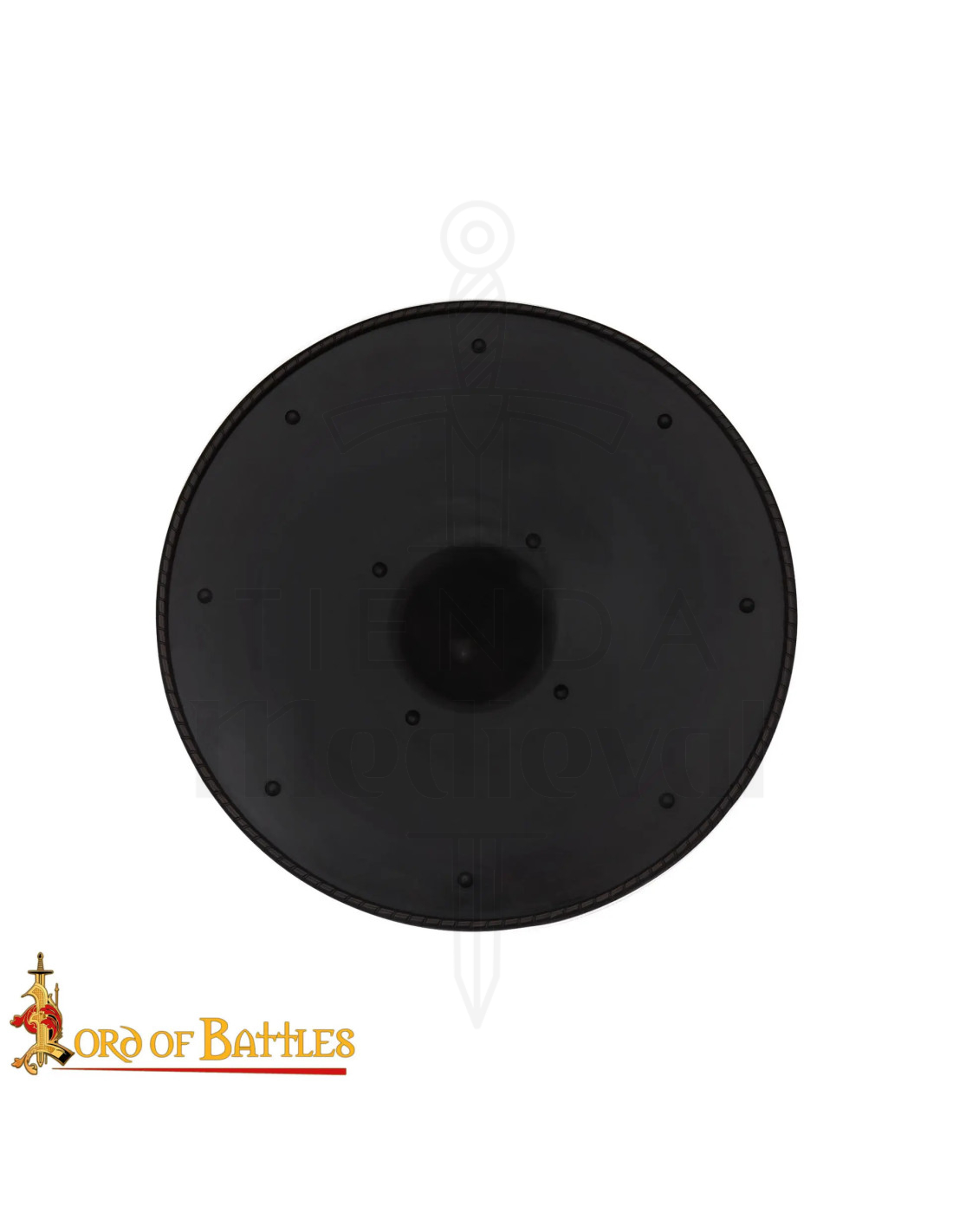 Håndsmidd i stål, dette Håndsmidd Vikingeskjold giver en autentisk følelse og en solid reaktion på indflydelse, uden at give afkald på den manøvredygtighed, der er nødvendig for præcise bevægelser. Dets naturlige finish og glatte overflade i sort med synlige nitter formidler den krigeræstetik, du søger, mens den teksturerede kant fungerer som en dæmper mod stød, hvilket beskytter skjoldets integritet og den, der bruger det. Det centrale stød i form af en fremspring beskytter ikke kun hånden, men muliggør også sikrere forsvarsstillinger.