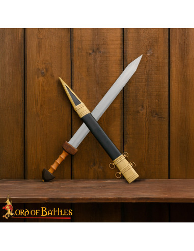 Denne tro kopi af Mainz Gladius giver en autentisk følelse takket være sin polerede stålblad og dobbelte skæfteprofil, som signalerer soliditet og et visuelt realisme perfekt til udstilling. Grebet af træ med ergonomisk design og riller tilbyder en behagelig og sikker greb, ideel for dem, der deltager i rekonstruktioner eller værdsætter et stykke, der kan håndteres med selvsikkerhed. Skeden i sort læder, afsluttet med messingbeslag og funktionelle ringe, gør det nemt at placere den i udstillinger og beskytter sværdet med en omhyggelig finish.