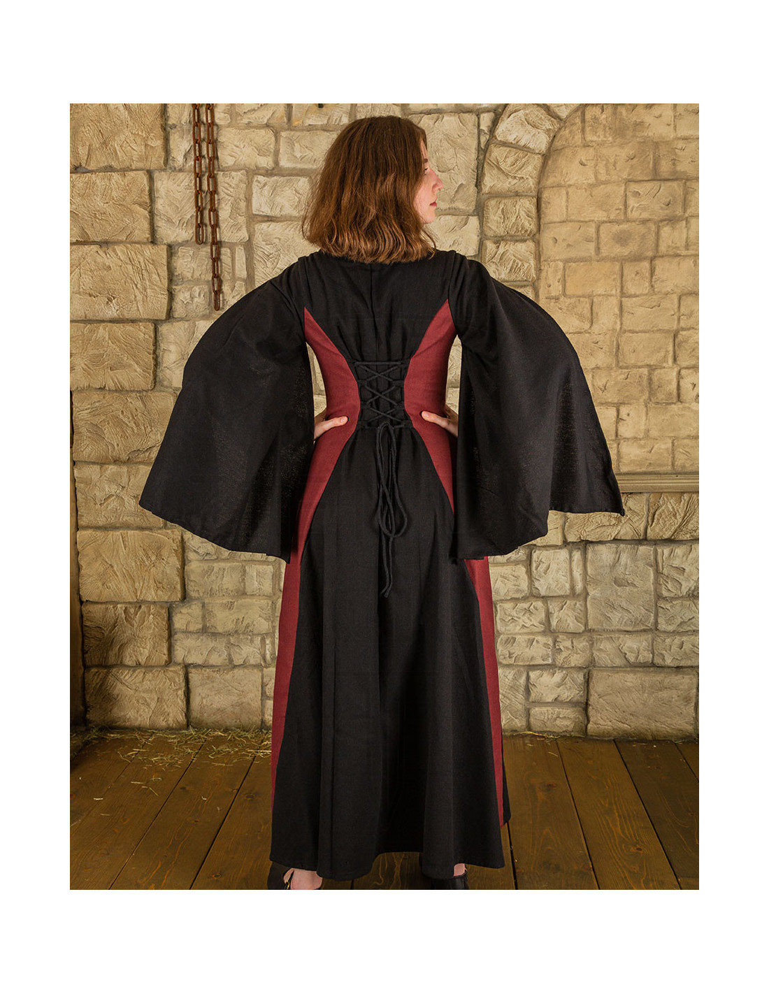 De 'falske' brede ærmer tilføjer et strejf af elegance og femininitet, fremhæver snittets finesse og kjolens unikke karakter. Den imponerende kombination af sort og bordeaux fremhæver elegance og historisk ånd, hvilket gør den ideel til reenactments, temafester eller blot til at bære med et strejf af mystik og sofistikation.