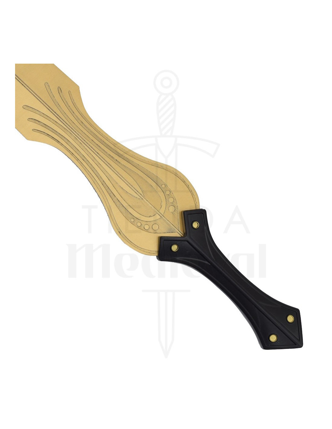 Dette sæt samler en replika med stander, der skiller sig ud med sin personlighed, designet til dem, der søger et dekorativt element med tilstedeværelse. Sværdet byder på et stålblad med en iøjnefaldende finish, der reflekterer lys og fremhæver de gyldne indgraveringer, hvilket giver en autentisk følelse uden at gå på kompromis med nemmontering og fremvisning.
