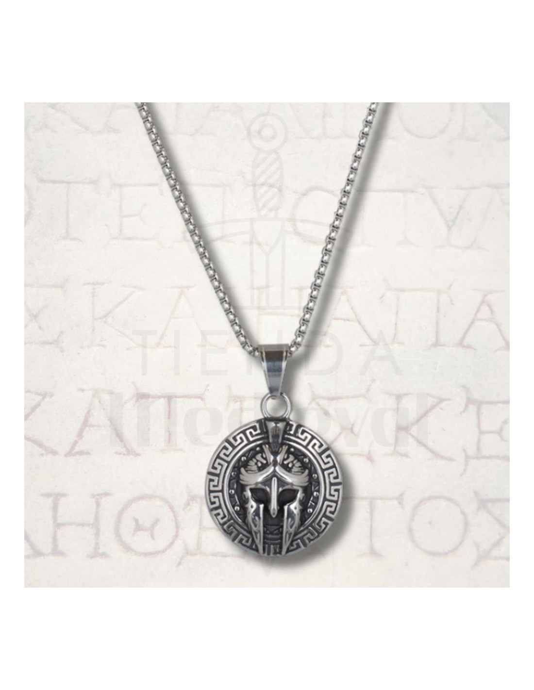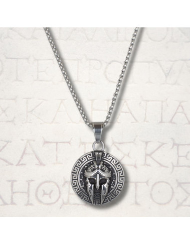 Opdag Tole10's halskæde med græsk hjelm og skjold, et smykke der hylder storheden og modet fra det gamle Grækenland. Dette halskæde, fremstillet i stål med en fejlfri blank finish, kombinerer styrke og elegance, så du kan bære det både til særlige lejligheder og i din hverdag. Dets cirkulære design, inspireret af de klassiske elementer fra den græske kultur, fremhæver en central hjelm omgivet af et intrikat dekorativt mønster i geometrisk stil, der fremkalder de legendariske helte fra denne historie-rige civilisation.
