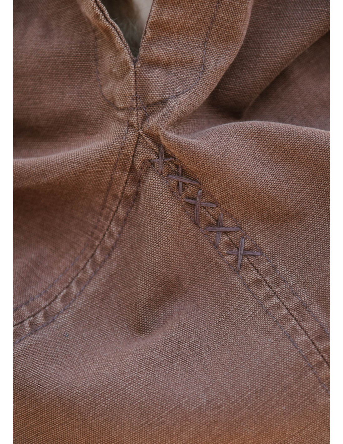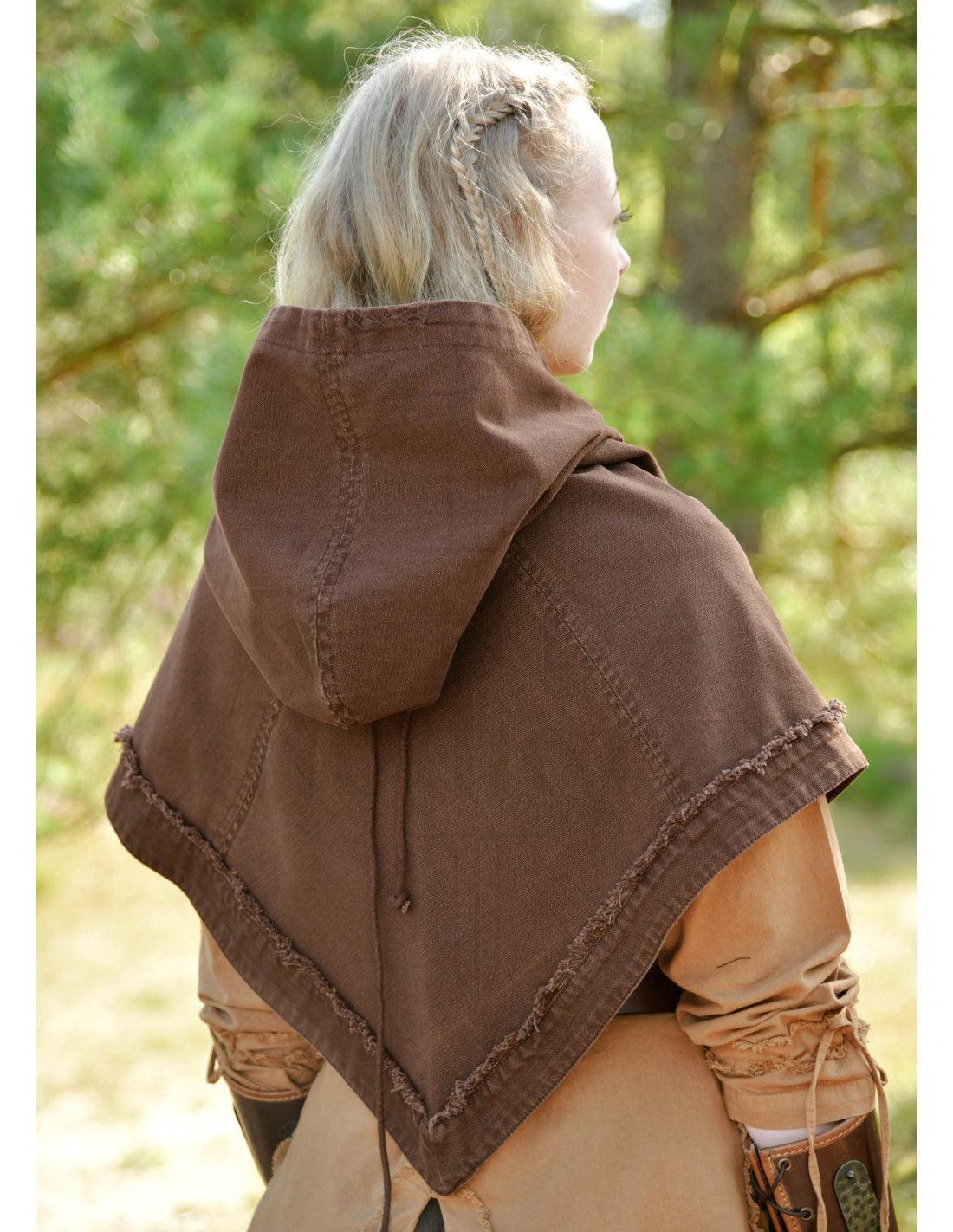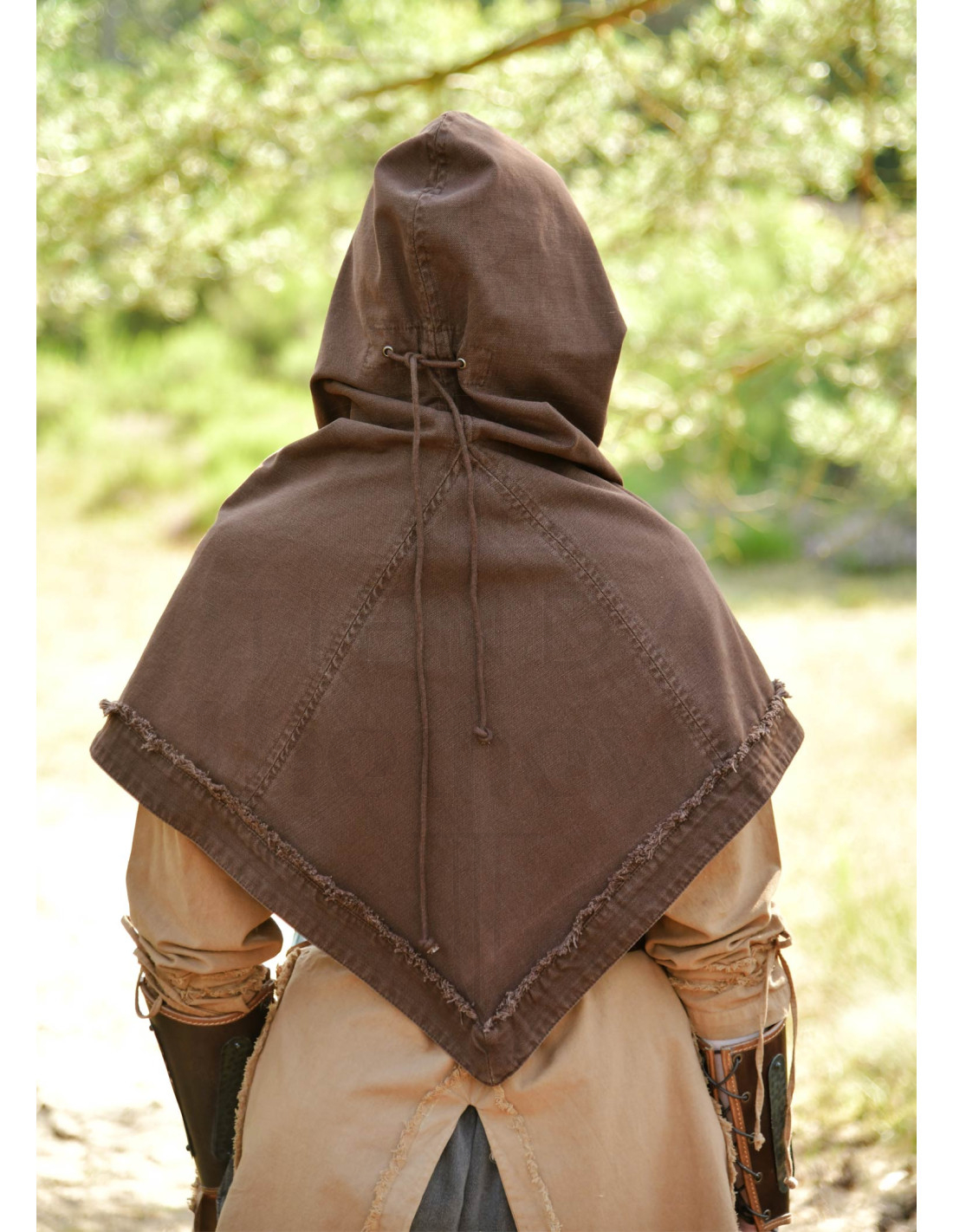 Fremstillet af 100% bomuld kombinerer denne gugel holdbarhed med en rustik stil, der vil ældes med karakter. Designet inkluderer slidte kanter og synlige sømme, der ser ud til at bære vægten af mange eventyr. Den trekantede form, med en råkant og en brystindsats, henviser til gamle fund og tilføjer et karakterfuldt og stemningsfuldt præg til ethvert middelalder- eller LARP-outfit.