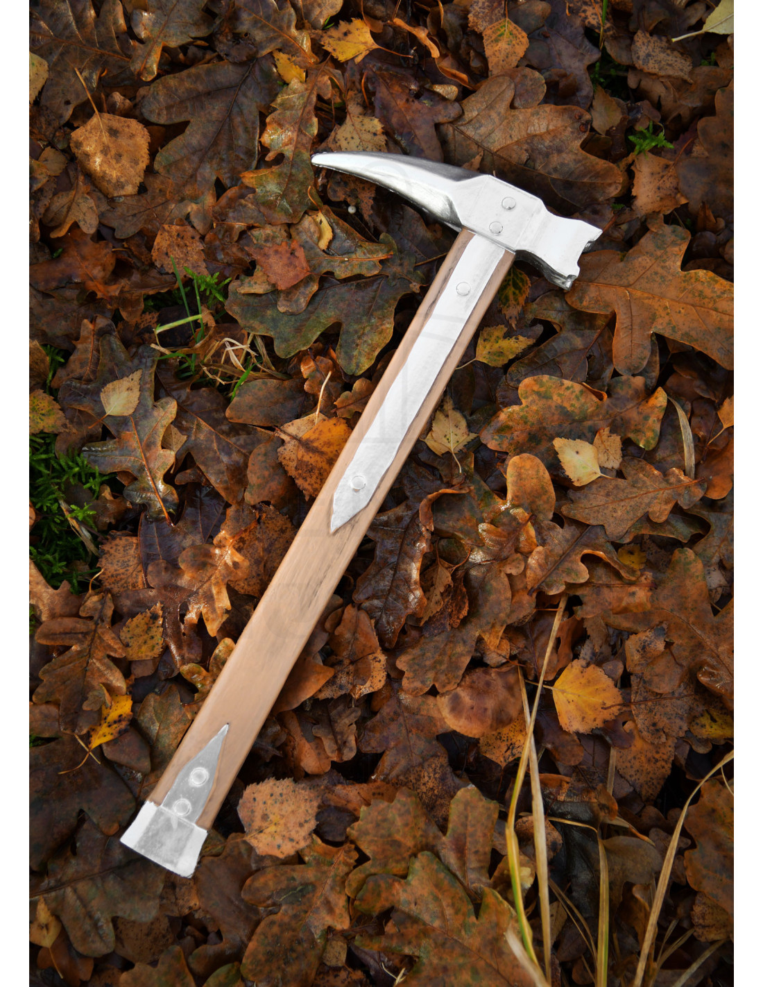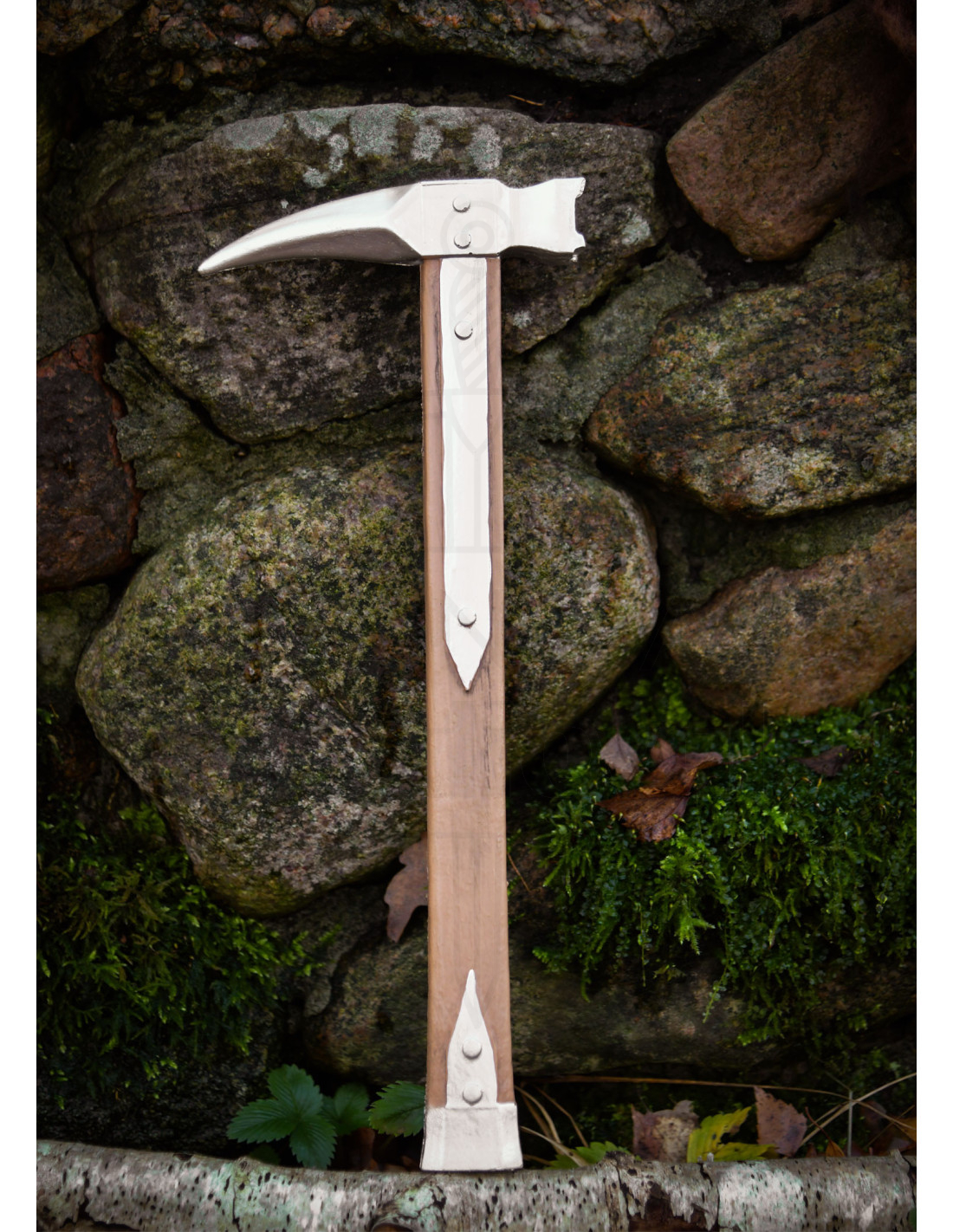 Skaftet, med åretegninger, der simulerer lys træ og metalforstærkninger nittet på strategiske punkter, giver ikke kun en æstetik af en hårdfør kriger, men også et sikkert greb og en følelse af holdbarhed. Det er en robust følgesvend, ideel til at forvandle gårde, legetøj slotte eller scener til ære.felter.