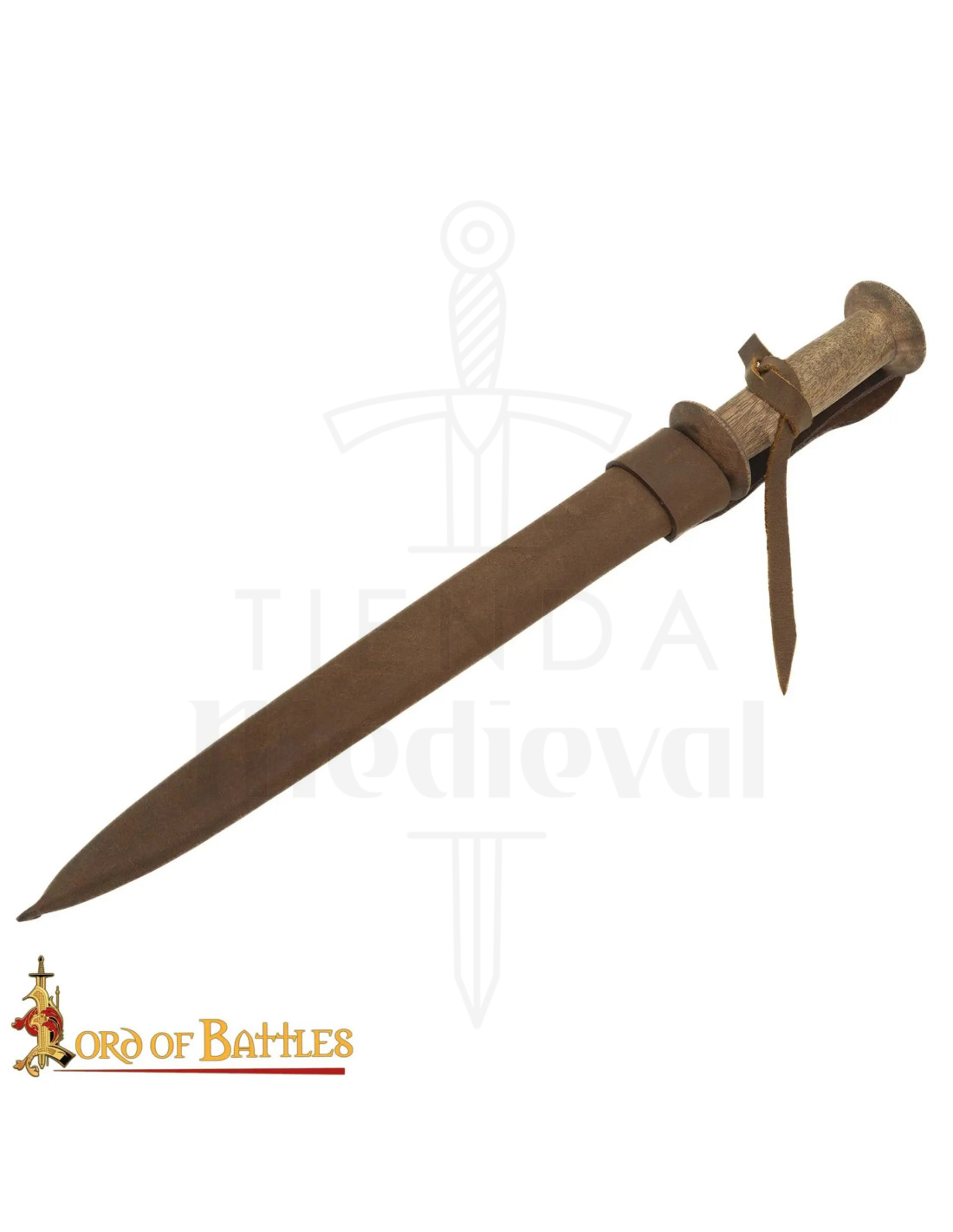Skeden i autenthisk læder, syet i hånden, beskytter stykket og tilføjer et visuelt realisme-element, mens det justerbare bælteletter gør det muligt at bære det sikkert og komfortabelt om livet. Hver variation i træets åre eller læderets tekstur fremhæver artikelens unikhed, hvilket gør det til et unikt element i dit kit eller historiske opsætning.