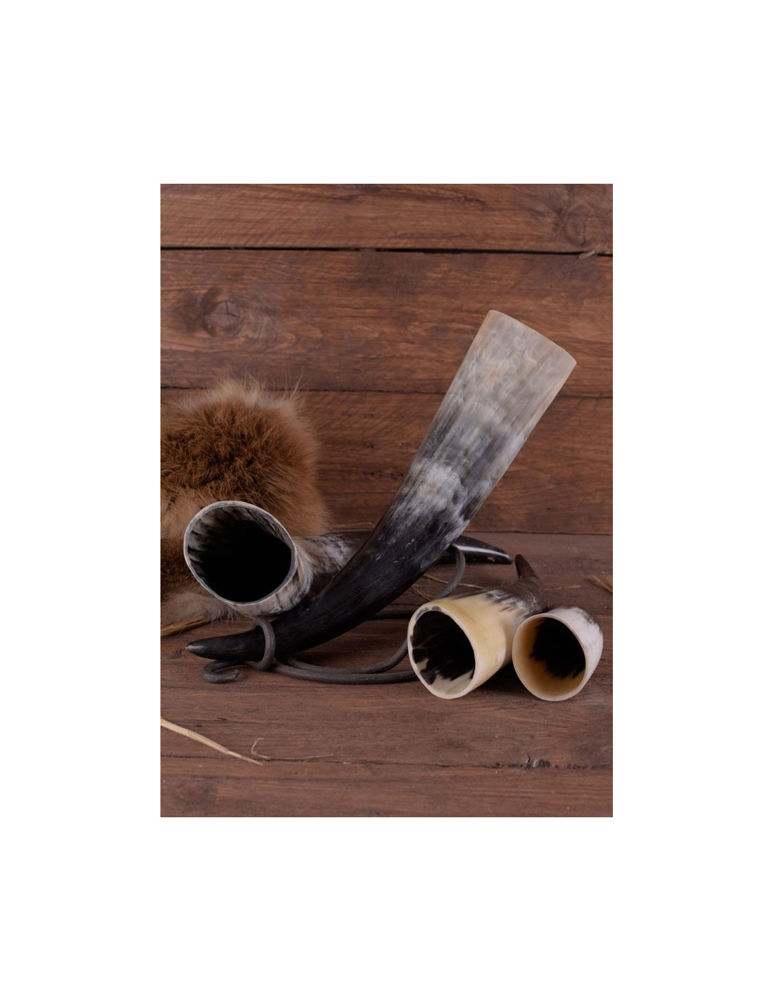 Materialet i vores horn er behandlet, poleret og lakeret dyregevir, hvilket garanterer dets holdbarhed og modstandsdygtighed. Derudover vil dets elegante design transportere dig direkte til vikingernes tid, hvilket giver dig en autentisk oplevelse fuld af historie.