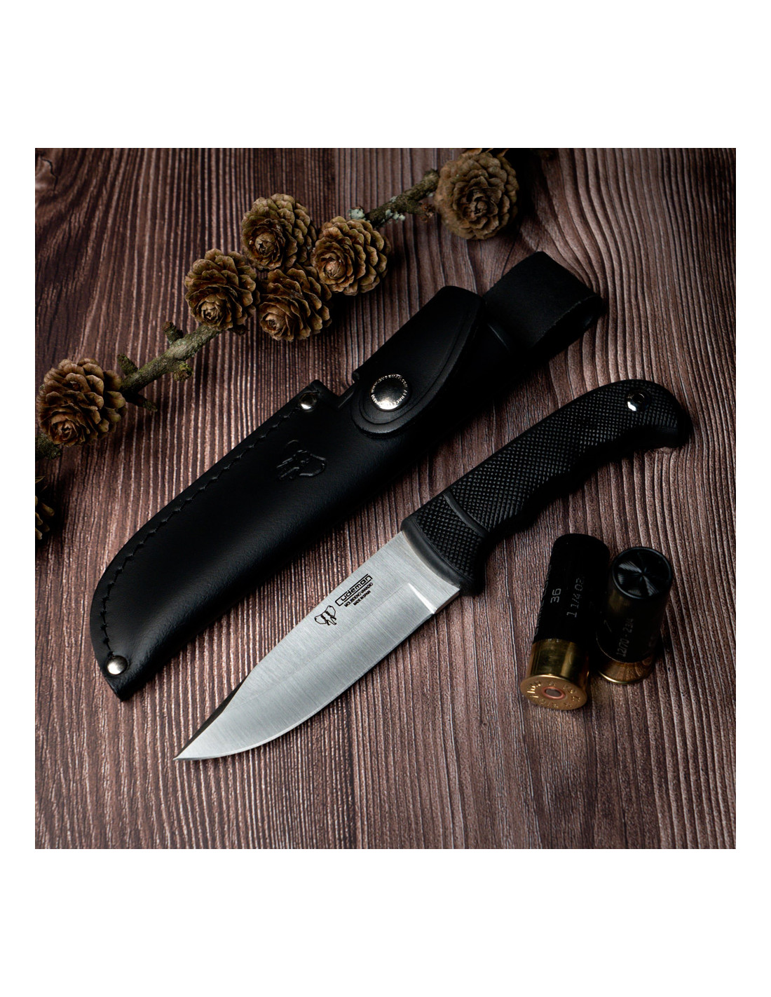 Med en stålhårdhed på 54/56 HRc tilbyder denne kniv en perfekt kombination af styrke og sejhed. Dens lette vægt på 159 gram og dens samlede længde på 22,5 cm gør den behagelig og nem at håndtere. Det sorte gummihåndtag, med en længde på 11,5 cm, giver et fast og sikkert greb i alle situationer.