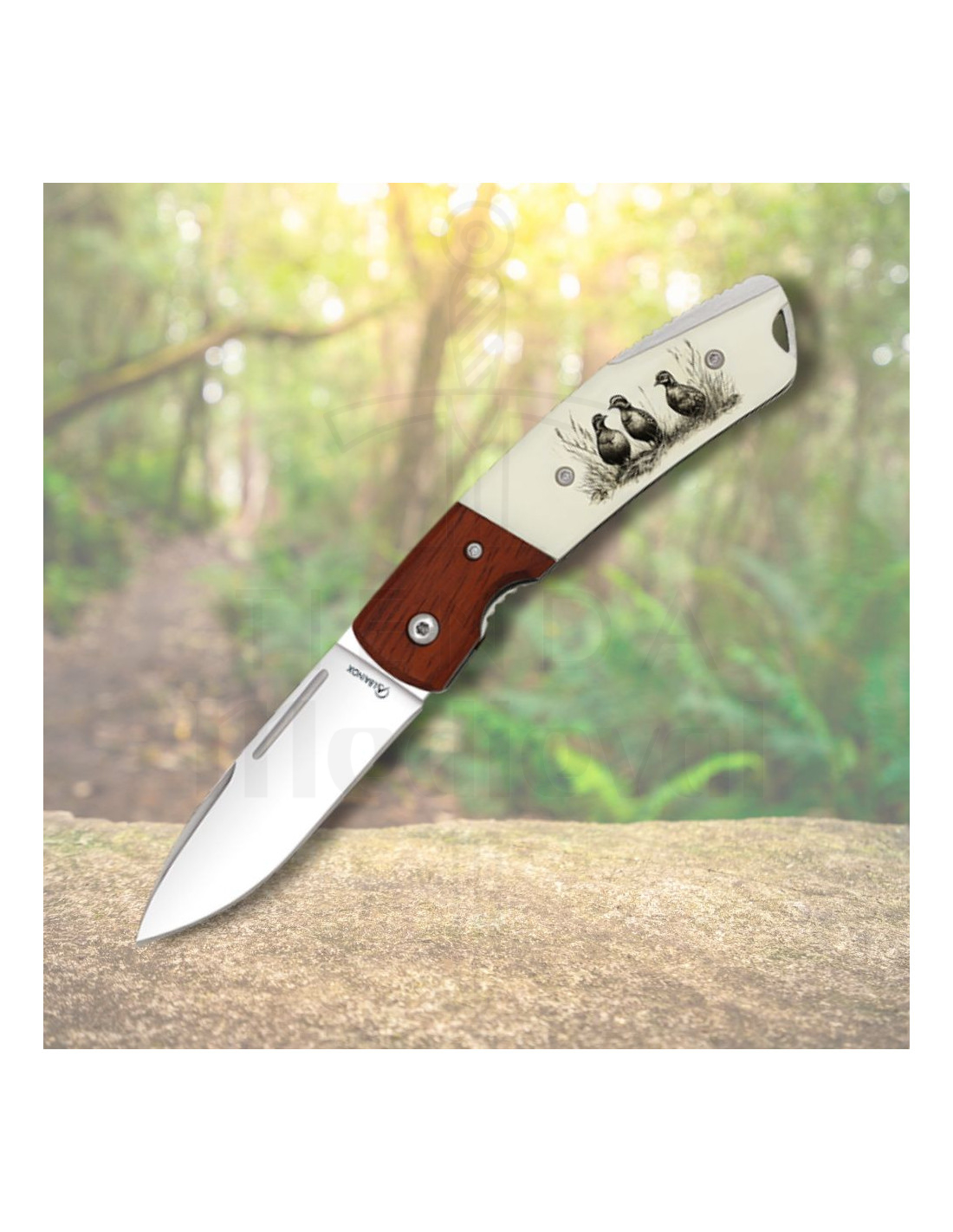 Håndtaget, fremstillet af holdbare materialer og dekoreret med en gravering, der forestiller tre fugle i deres naturlige omgivelser, tilføjer et karakteristisk og autentisk præg, der afspejler friluftslivets ånd. Derudover gør den robuste, men lette struktur det nemt at transportere og bruge over længere tid uden træthed.